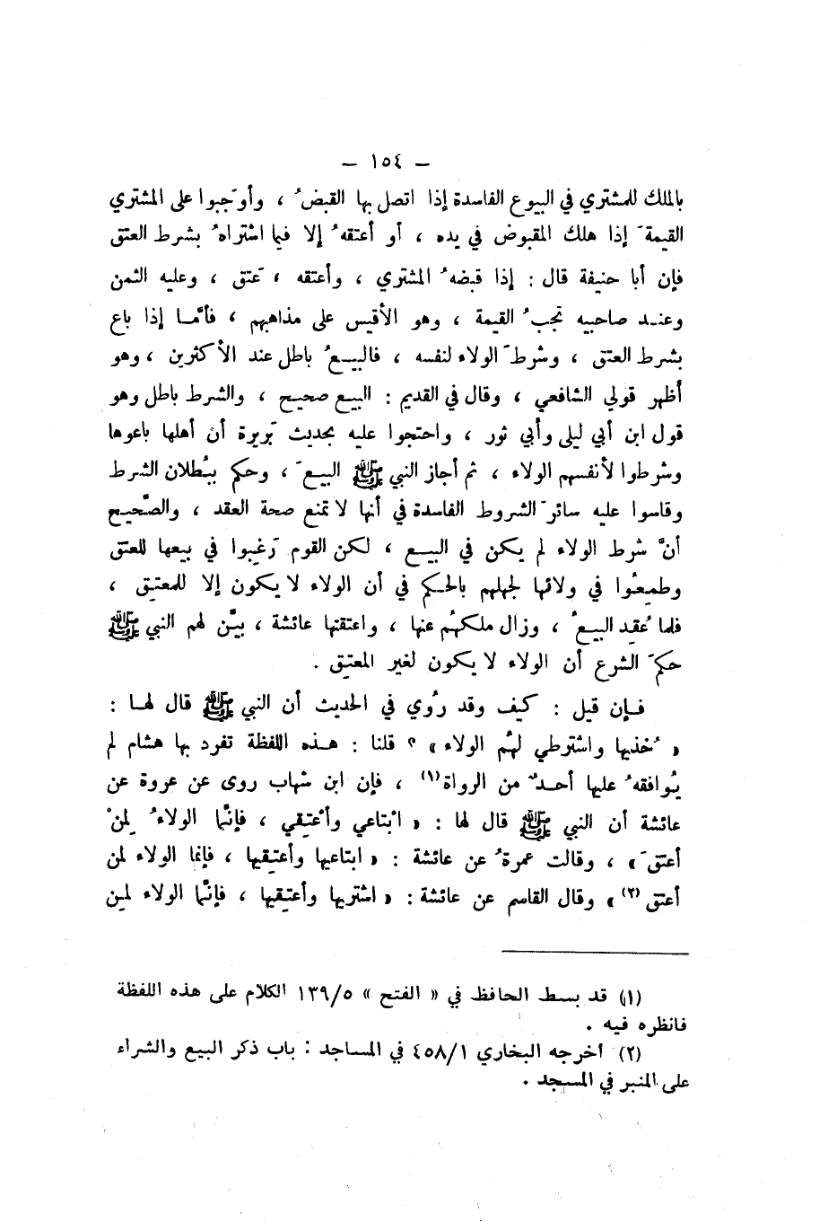 فَإِنْ قِيلَ: كَيْفَ وَقَدْ رُوِيَ فِي الْحَدِيثِ أَنَّ النَّبِيَّ صَلَّى اللهُ عَلَيْهِ وَسَلَّمَ قَالَ لَهَا: «خُذِيهَا وَاشْتَرِطِي لَهُمُ الْوَلاءَ» قُلْنَا: هَذِهِ اللَّفْظَةُ تَفَرَّدَ بِهَا هِشَامٌ، لَمْ يُوَافِقْهُ عَلَيْهَا أَحَدٌ مِنَ الرُّوَاةِ، فَإِنَّ ابْنَ شِهَابٍ، رَوَى عَنْ عُرْوَةَ، عَنْ عَائِشَةَ، أَنَّ النَّبِيَّ صَلَّى اللهُ عَلَيْهِ وَسَلَّمَ، قَالَ لَهَا: «ابْتَاعِي وَأَعْتِقي، فَإِنَّمَا الْوَلاءُ لِمَنْ أَعْتَقَ»، وَقَالَتْ عَمْرَةُ، عَنْ عَائِشَةَ: «ابْتَاعِيهَا وَأَعْتِقِيهَا، فَإِنَّمَا الوَلاءُ لِمَنْ أَعْتَقَ» وَقَالَ الْقَاسِمُ، عَنْ عَائِشَةَ: «اشْتَرِيهَا وأَعْتِقِيهَا، فَإِنَّمَا الْوَلاءُ لِمَنْ