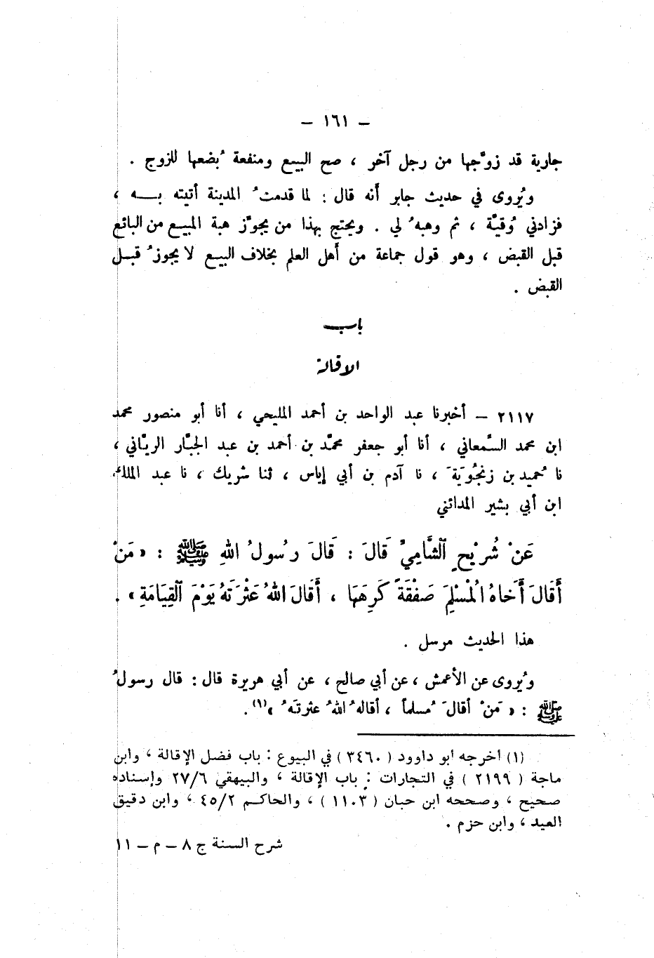 2117 - أَخْبَرَنَا عَبْدُ الْوَاحِدِ بْنُ أَحْمَدَ الْمَلِيحِيُّ، أَنا أَبُو مَنْصُورٍ مُحَمَّدُ بْنُ مُحَمَّدٍ السَّمْعَانِيُّ، أَنا أَبُو جَعْفَرٍ مُحَمَّدُ بْنُ أَحْمَدَ بْنِ عَبْدِ الْجَبَّارِ الرَّيَّانِيُّ، نَا حُمَيْدُ بْنُ زَنْجُوَيْهِ، نَا آدَمُ بْنُ أَبِي إِيَاسٍ، ثَنَا شَرِيكٌ، نَا عَبْدُ الْمَلِكِ بْنُ أَبِي بَشِيرٍ الْمَدَائِنِيُّ، عَنْ شُرَيْحٍ الشَّامِيِّ، قَالَ: قَالَ رَسُولُ اللَّهِ صَلَّى اللهُ عَلَيْهِ وَسَلَّمَ: «مَنْ أَقَالَ أَخَاهُ المُسْلِمَ صَفْقَةً كَرِهَهَا، أَقَالَ اللَّهُ عَثْرَتَهُ يَوْمَ الْقِيَامَةِ».