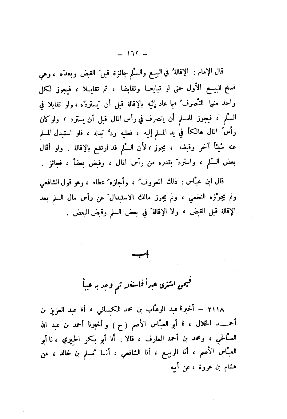 قَالَ الإِمَامُ: الإِقَالَةُ فِي الْبَيْعِ وَالسَّلَمِ جَائِزَةٌ، قَبْلَ الْقَبْضِ وَبَعْدَهُ، وَهِيَ فَسْخٌ لِلْبَيْعِ الأَوَّلِ حَتَّى لَوْ تَبَايَعَا وَتَقَابَضَا ثُمَّ تَقَايَلا، فَيَجُوزُ لِكُلِّ وَاحِدٍ مِنْهُمَا التَّصَرُّفُ فِيمَا عَادَ إِلَيْهِ بِالإِقَالَةِ قَبْلَ أَنْ يَسْتَرِدَّهُ، وَلَوْ تَقَايَلا فِي السَّلَمِ، فَيَجُوزُ لِلْمُسَلَّمِ أَنْ يَتَصَرَّفَ فِي رَأْسِ الْمَالِ قَبْلَ أَنْ يُسْتَرَدَّ، وَلَوْ كَانَ رَأَسُ الْمَالِ هَالِكًا فِي يَدِ الْمُسَلَّمِ إِلَيْهِ، فَعَلَيْهِ رَدُّ بَدَلِهِ، فَلَوِ اسْتَبْدَلَ الْمُسَلَّمُ عَنْهُ شَيْئًا آخَرَ وَقَبَضَهُ، يَجُوزُ، لأَنَّ السَّلَمَ قَدِ ارْتَفَعَ بِالإِقَالَةِ، وَلَوْ أَقَالَ بَعْضَ السَّلَمِ، وَاسْتَرَدَّ بِقَدْرِهِ مِنْ رَأْسِ الْمَالِ، وَقَبَضَ بَعْضًا، فَجَائِزٌ.