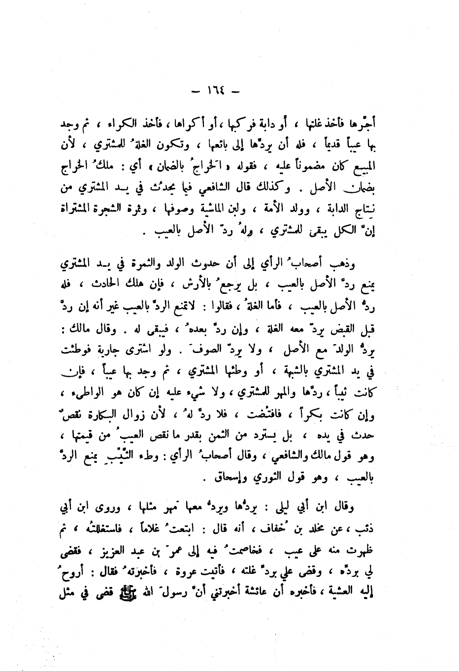 وَقَالَ مَالِكٌ: يَرُدُّ الْوَلَدَ مَعَ الأَصْلِ، وَلا يَرُدُّ الصُّوفَ، وَلَوِ اشْتَرَى جَارِيَةً فَوَطِئَتْ فِي يَدِ الْمُشْتَرِي بِالشُّبْهَةِ، أَوْ وَطِئَهَا الْمُشْتَرِي، ثُمَّ وَجَدَ بِهَا عَيْبًا، فَإِنْ كَانَتْ ثَيِّبًا، رَدَّهَا وَالْمَهْرُ لِلْمُشْتَرِي، وَلا شَيْءَ عَلَيْهِ إِنْ كَانَ هُوَ الْواطِئُ، وَإِنْ كَانَتْ بِكْرًا فَافْتُضَّتْ، فَلا رَدَّ لَهُ، لأَنَّ زَوَالَ الْبَكَارَةِ نَقْصٌ حَدَثَ فِي يَدِهِ، بَلْ يَسْتَرِدُّ مِنَ الثَّمَنِ بِقَدْرِ مَا نَقَصَ الْعَيْبُ مِنْ قِيمَتِهَا، وَهُوَ قَوْلُ مَالِكٍ وَالشَّافِعِيِّ، وَقَالَ أَصْحَابُ الرَّأْيِ: وَطْءُ الثَّيِّبِ يَمْنَعُ الرَّدَّ بِالْعَيْبِ، وَهُوَ قَوْلُ الثَّوْرِيِّ وَإِسْحَاقَ.
