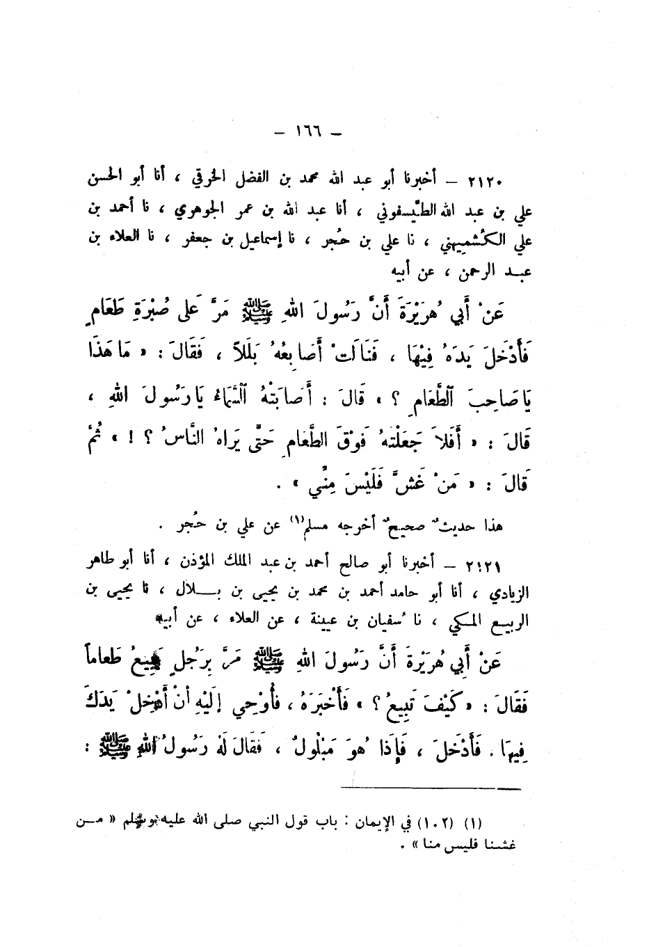 2120 - أَخْبَرَنَا أَبُو عَبْدِ اللَّهِ مُحَمَّدُ بْنُ الْفَضْلِ الْخَرَقِيُّ، أَنا أَبُو الْحَسَنِ عَلِيُّ بْنُ عَبْدِ اللَّهِ الطَّيْسَفُونِيُّ، أَنا عَبْدُ اللَّهِ بْنُ عُمَرَ الْجَوْهَرِيُّ، نَا أَحْمَدُ بْنُ عَلِيٍّ الْكُشْمِيهَنِيُّ، نَا عَلِيُّ بْنُ حُجْرٍ، نَا إِسْمَاعِيلُ بْنُ جَعْفَرٍ، نَا الْعَلَاءُ بْنُ عَبْدِ الرَّحْمَنِ، عَنْ أَبِيهِ، عَنْ أَبي هُرَيْرَةَ، " أَنَّ رَسُولَ اللَّه صَلَّى اللهُ عَلَيْهِ وَسَلَّمَ مَرَّ عَلَى صُبْرةِ طَعَامٍ فَأَدْخَلَ يَدَهُ فِيهَا، فَنَالَتْ أَصَابِعُهُ بَلَلا، فَقَالَ: مَا هَذَا يَا صَاحِبَ الطَّعَامِ؟ قَالَ: أَصَابَتْهُ السَّمَاءُ يَا رَسُولَ اللَّهِ.