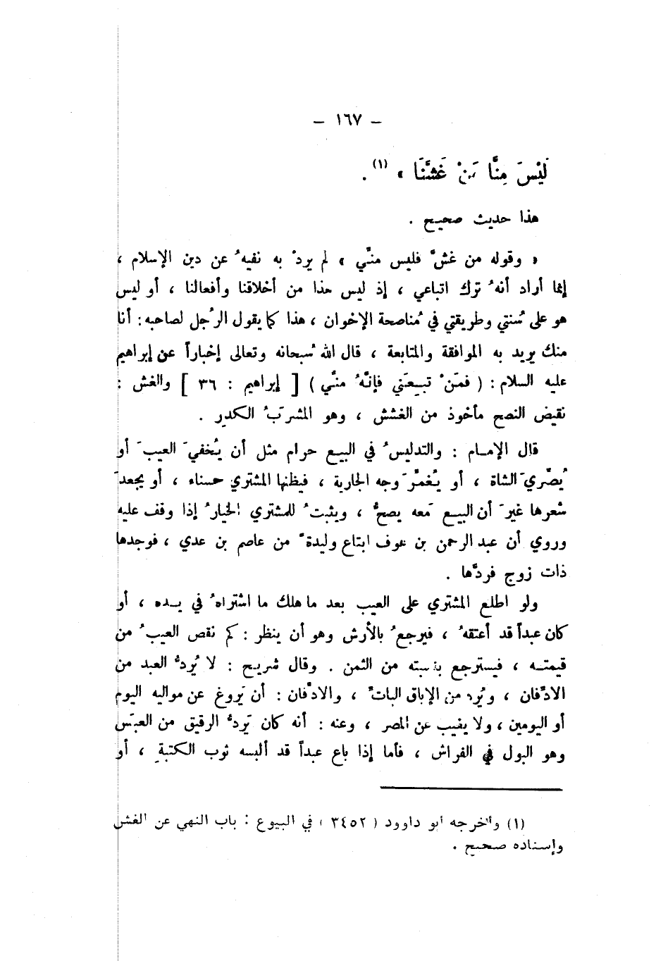 وَقَوْلُهُ: «مَنْ غَشَّ فَلَيْسَ مِنِّي» لَمْ يُرِدْ بِهِ نَفْيُهُ عَنْ دِينِ الإِسْلامِ، إِنَّمَا أَرَادَ أَنَّهُ تَرَكَ اتِّبَاعِي، إِذْ لَيْسَ هَذَا مِنْ أَخْلَاقِنَا وَأَفْعَالِنَا، أَوْ لَيْسَ هُوَ عَلَى سُنَّتِي وَطَرِيقَتِي، فِي مُنَاصَحَةِ الإِخْوَانِ، هَذَا كَمَا يَقُولُ الرَّجُلُ لِصَاحِبِهِ: أَنَا مِنْكَ يُرِيدُ بِهِ الْمُوَافَقَةَ وَالْمُتَابَعَةَ، قَالَ اللَّهُ سُبْحَانَهُ وَتَعَالَى إِخْبَارًا عَنْ إِبْرَاهِيمَ عَلَيْهِ السَّلامُ: {فَمَنْ تَبِعَنِي فَإِنَّهُ مِنِّي} [إِبْرَاهِيم: 36] وَالْغِشُّ: نَقِيضُ النُّصْحِ، مَأْخُوذٌ مِنَ الْغَشَشِ، وَهُوَ الْمَشْرَبُ الْكَدِرُ.