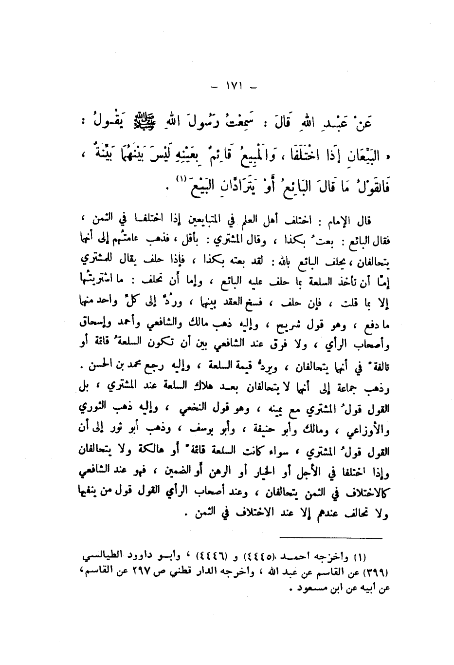 عَنْ عَبْدِ اللَّهِ، قَالَ: سَمِعْتُ رَسُولَ اللَّه صَلَّى اللهُ عَلَيْهِ وَسَلَّمَ يَقُولُ: «الْبَيِّعَانِ إِذَا اخْتَلَفَا وَالْمَبِيعُ قَائِمٌ بِعَيْنِهِ لَيْسَ بَيْنَهُمَا بَيَّنَةٌ، فَالْقَوْلُ مَا قَالَ الْبَائِعُ أَوْ يَتَرَادَّانِ البَيْعَ».