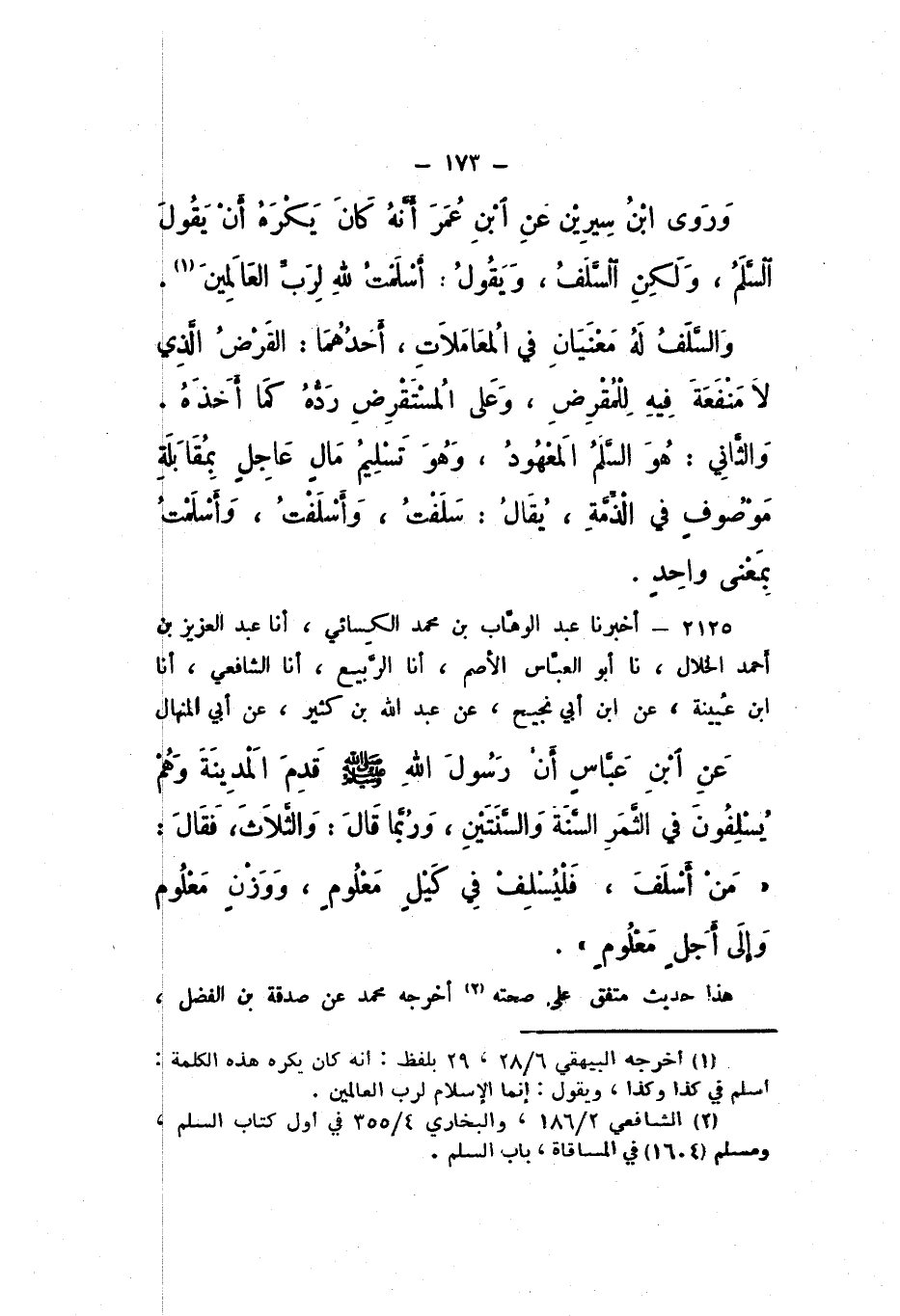 2124 - أَخْبَرَنَا عَبْدُ الْوَهَّابِ بْنُ مُحَمَّدٍ الْكِسَائِيُّ، أَنا عَبْدُ الْعَزِيزِ بْنُ أَحْمَدَ الْخَلالُ، نَا أَبُو الْعَبَّاسِ الأَصَمُّ، أَنا الرَّبِيعُ، أَنا الشَّافِعِيُّ، أَنا ابْنُ عُيَيْنَةَ، عَنِ ابْنِ أَبِي نَجِيحٍ، عَنْ عَبْدِ اللَّهِ بْنِ كَثِيرٍ، عَنْ أَبِي الْمِنْهَالِ، عَنِ ابْنِ عَبَّاسٍ، أَنَّ رَسُولَ اللَّهِ صَلَّى اللهُ عَلَيْهِ وَسَلَّمَ قَدِمَ المَدينَةَ وَهُمْ يُسْلِفُونَ فِي الثَّمَرِ السَّنَةَ وَالسَّنَتَيْنِ، وَرُبَّمَا قَالَ: والثَّلاثَ، فَقَالَ: «مَنْ أَسْلَفَ، فَلْيُسْلِفْ فِي كَيْلٍ مَعْلُومٍ، وَوَزْنٍ مَعْلُومٍ، وَإِلَى أَجَلٍ مَعْلُومٍ».