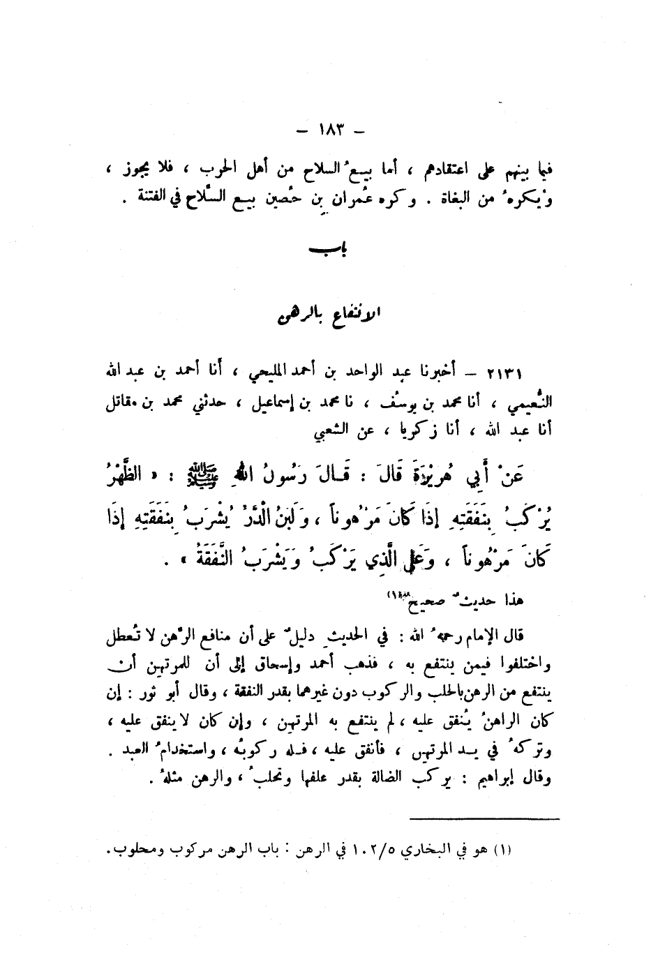 2130 - أَخْبَرَنَا عَبْدُ الْوَاحِدِ بْنُ أَحْمَدَ الْمَلِيحِيُّ، أَنا أَحْمَدُ بْنُ عَبْدِ اللَّهِ النُّعَيْمِيُّ، أَنا مُحَمَّدُ بْنُ يُوسُفَ، نَا مُحَمَّدُ بْنُ إِسْمَاعِيلَ، حَدَّثَنِي مُحَمَّدُ بْنُ مُقَاتِلٍ، أَنا عَبْدُ اللَّهِ، أَنا زَكَرِيَّا، عَنِ الشَّعْبِيِّ، عَنْ أَبي هُرَيْرَةَ، قَالَ: قَالَ رَسُولُ اللَّهِ صَلَّى اللهُ عَلَيْهِ وَسَلَّمَ: «الظَّهْرُ يُرْكَبُ بِنَفَقَتِهِ إِذَا كَانَ مَرْهُونًا، وَلَبَنُ الدَّرِّ يُشْرَبُ بِنَفَقَتِهِ إِذَا كَانَ مَرْهُونًا، وَعَلَى الَّذِي يَرْكَبُ ويَشْربُ النَّفَقَةُ».