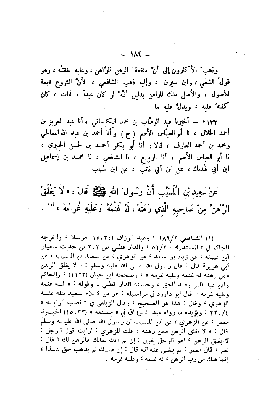 ح وَأَنا أَحْمَدُ بْنُ عَبْدِ اللَّهِ الصَّالِحِيُّ، وَمُحَمَّدُ بْنُ أَحْمَدَ الْعَارِفُ، قَالا: أَنا أَبُو بَكْرٍ أَحْمَدُ بْنُ الْحَسَنِ الْحِيرِيُّ، نَا أَبُو الْعَبَّاسِ الأَصَمُّ، أَنا الرَّبِيعُ، نَا الشَّافِعِيُّ، نَا مُحَمَّدُ بْنُ إِسْمَاعِيلَ بْنِ أَبِي فُدَيْكٍ، عَنِ ابْنِ أَبِي ذِئْبٍ، عَنِ ابْنِ شِهَابٍ، عَنْ سَعِيدِ بْنِ الْمُسَيِّبِ، أَنَّ رَسُولَ اللَّهِ صَلَّى اللهُ عَلَيْهِ وَسَلَّمَ، قَالَ: «لَا يَغْلَقُ الرَّهْنُ مِنْ صَاحِبِهِ الَّذِي رَهَنَهُ، لَهُ غُنْمُهُ وَعَلَيْهِ غُرْمُهُ».