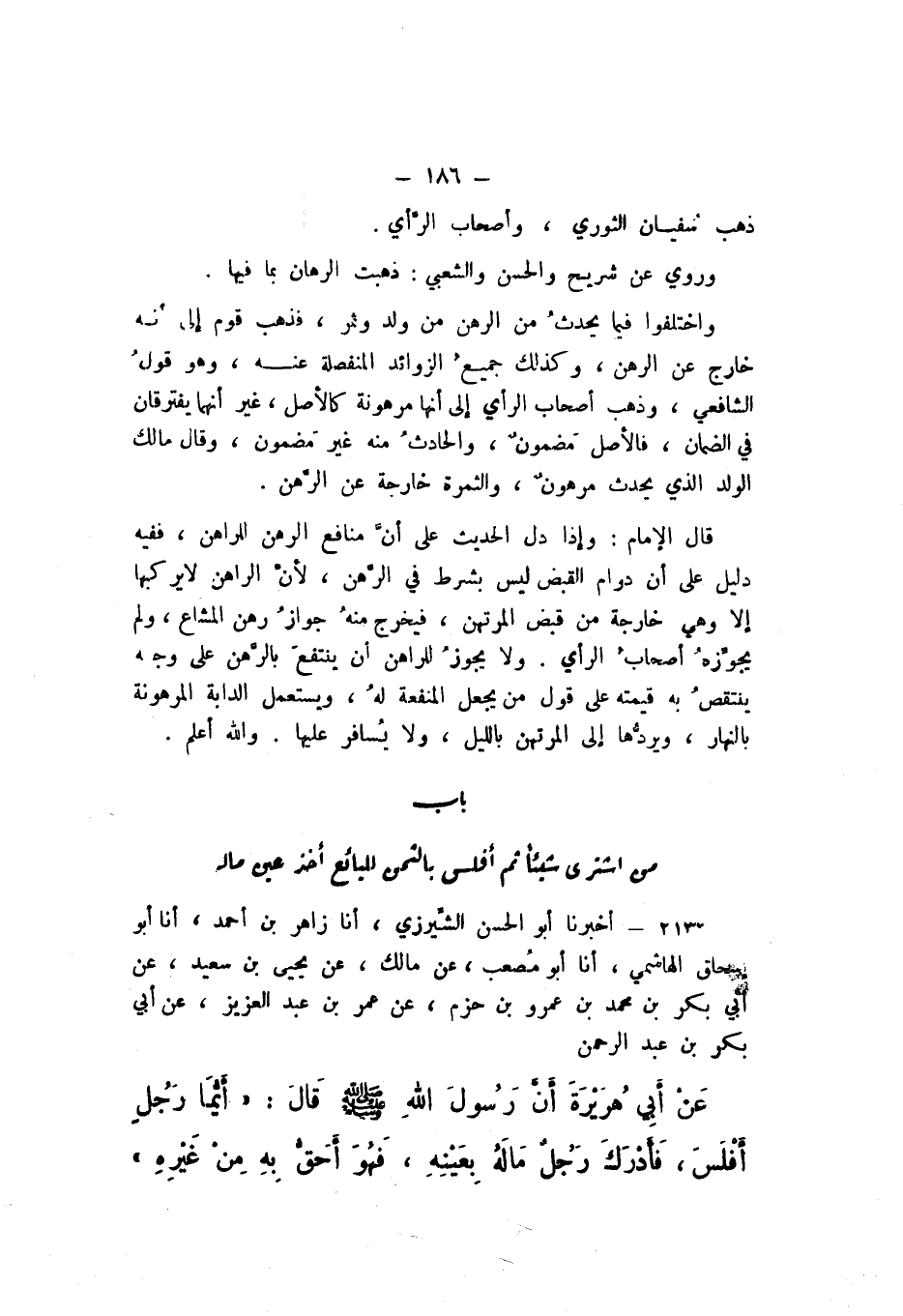 2133 - أَخْبَرَنَا أَبُو الْحَسَنِ الشِّيرَزِيُّ، أَنا زَاهِرُ بْنُ أَحْمَدَ، أَنا أَبُو إِسْحَاقَ الْهَاشِمِيُّ، أَنا أَبُو مُصْعَبٍ، عَنْ مَالِكٍ، عَنْ يَحْيَى بْنِ سَعِيدٍ، عَنْ أَبِي بَكْرِ بْنِ مُحَمَّدِ بْنِ عَمْرِو بْنِ حَزْمٍ، عَنْ عُمَرَ بْنِ عَبْدِ الْعَزِيزِ، عَنْ أَبِي بَكْرِ بْنِ عَبْدِ الرَّحْمَنِ، عَنْ أَبي هُرَيْرَةَ، أَنَّ رَسُولَ اللَّهِ صَلَّى اللهُ عَلَيْهِ وَسَلَّمَ قَالَ: «أَيُّمَا رَجُلٍ أَفْلَسَ، فَأَدْرَكَ رَجُلٌ مَالَهُ بِعَيْنِهِ، فَهُوَ أَحَقُّ بِهِ مِنْ غَيْرِهِ».