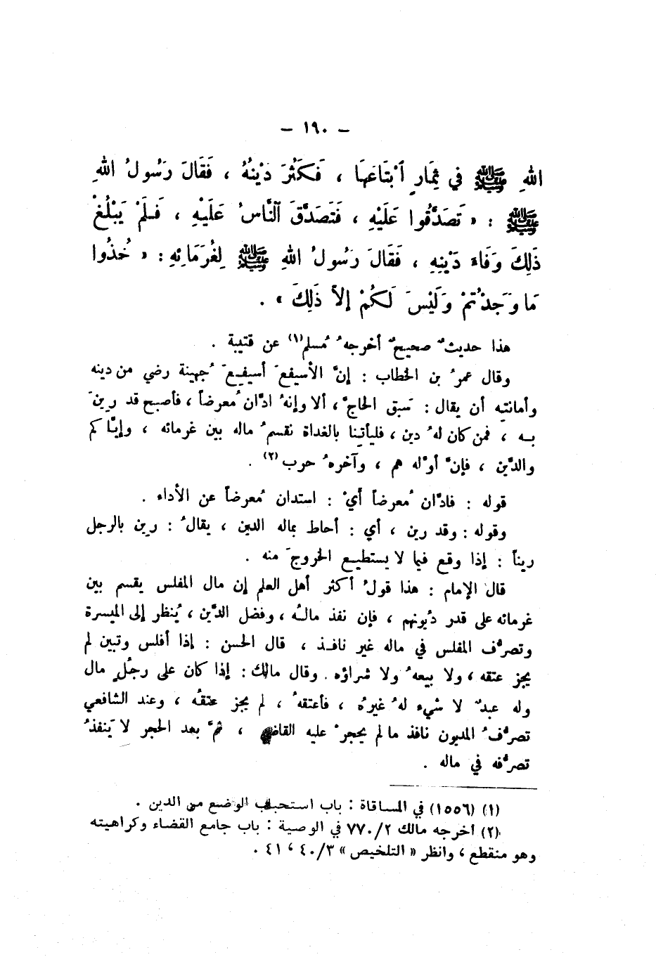 اللَّهِ صَلَّى اللهُ عَلَيْهِ وَسَلَّمَ فِي ثِمارٍ ابْتَاعَهَا، فَكَثُرَ دَيْنُهُ، فَقَالَ رَسُولُ اللَّه صَلَّى اللهُ عَلَيْهِ وَسَلَّمَ: «تَصَدَّقُوا عَلَيْهِ»، فَتَصَدَّقَ النَّاسُ عَلَيْهِ، فَلَمْ يَبْلُغْ ذَلِكَ وَفَاءَ دَيْنِهِ، فَقَالَ رَسُولُ اللَّهِ صَلَّى اللهُ عَلَيْهِ وَسَلَّمَ لِغُرَمَائِه: «خُذُوا مَا وَجَدْتُمْ وَلَيْسَ لَكُمْ إِلا ذَلِكَ».