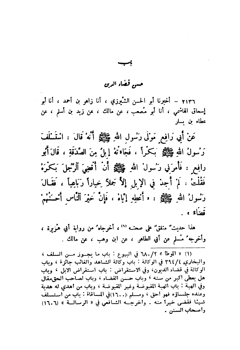 2136 - أَخْبَرَنَا أَبُو الْحَسَنِ الشِّيرَزِيُّ، أَنا زَاهِرُ بْنُ أَحْمَدَ، أَنا أَبُو إِسْحَاقَ الْهَاشِمِيُّ، أَنا أَبُو مُصْعَبٍ، عَنْ مَالِكٍ، عَنْ زَيْدِ بْنِ أَسْلَمَ، عَنْ عَطَاءِ بْنِ يَسَارٍ، عَنْ أَبِي رَافِعٍ مَوْلَى رَسُولِ اللَّهِ صَلَّى اللهُ عَلَيْهِ وَسَلَّمَ، أَنَّهُ قَالَ: اسْتَسْلَفَ رَسُولُ اللَّهِ صَلَّى اللهُ عَلَيْهِ وَسَلَّمَ بَكْرًا، فَجَاءَتْهُ إِبلٌ مِنَ الصَّدَقَةِ، قَالَ أَبُو رَافِعٍ: فَأَمَرَنِي رَسُولُ اللَّهِ صَلَّى اللهُ عَلَيْهِ وَسَلَّمَ أَنْ أَقْضِيَ الرَّجُلَ بَكْرَهُ، فَقُلْتُ: لَمْ أَجِدْ فِي الإِبِلِ إِلا جَمَلا خِيَارًا رَبَاعِيًا، فَقَالَ رَسُولُ اللَّهِ صَلَّى اللهُ عَلَيْهِ وَسَلَّمَ: «أَعْطِهِ إيَّاهُ، فَإِنَّ خَيْرَ النَّاسِ أَحْسَنُهُمْ قَضَاءً».