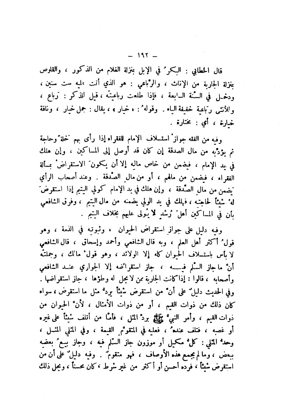وَفِيهِ دَليِلٌ عَلَى جَوَازِ اسْتِقْرَاضِ الْحَيَوَانِ، وَثُبُوتِهِ فِي الذِّمَّةِ، وَهُوَ قَوْلُ أَكْثَرِ أَهْلِ الْعِلْمِ، وَبِهِ قَالَ الشَّافِعِيُّ، وَأَحْمَدُ، وَإِسْحَاقُ، قَالَ الشَّافِعِيُّ: لَا بَأْسَ بِاسْتِسْلافِ الْحَيَوَانِ كُلِّهِ إِلا الْوَلائِدَ، وَهُوَ قَوْلُ مَالِكٍ، وَجُمْلَتُهُ أَنَّ مَا جَاءَ السَّلَمُ فِيهِ، جَازَ اسْتِقْرَاضُهُ إِلا الْجَوَارِيَ عِنْدَ الشَّافِعِيِّ وَأَصْحَابِهِ، قَالُوا: إِذَا كَانَتِ الْجَارِيَةُ مِمَّنْ لَا يَحِلُّ لَهُ وَطْؤُهَا، جَازَ اسْتِقْرَاضُهَا، وَفِي الْحَدِيثِ دَلِيلٌ عَلَى أَنَّ مَنِ اسْتَقْرَضَ شَيْئًا يَرُدُّ مِثْلَ مَا اسْتَقْرَضَ، سَوَاءٌ كَانَ ذَلِكَ مِنْ ذَوَاتِ الْقِيَمِ أَوْ مِنْ ذَوَاتِ الأَمْثَالِ، لأَنَّ الْحَيَوَانَ مِنْ ذَوَاتِ الْقِيَمِ، وَأَمَرَ النَّبِيُّ صَلَّى اللهُ عَلَيْهِ وَسَلَّمَ بِرَدِّ الْمِثْلِ، فَأَمَّا مَنْ أَتْلَفَ شَيْئًا عَلَى غَيْرِهِ أَوْ غَصَبَهُ فَتُلِفَ عِنْدَهُ، فَعَلَيْهِ فِي الْمُتَقَوَّمِ الْقِيمَةُ، وَفِي الْمِثْلِيِّ الْمِثْلُ، وَحَدُّ الْمِثْلِيِّ: كُلُّ مَكِيلٍ أَوْ مَوْزُونٍ جَازَ السَّلَمُ فِيهِ، وَجَازَ بَيْعُ بَعْضِهِ بِبَعْضٍ، وَمَا لَمْ يَجْمَعْ هَذِهِ الأَوْصَافِ، فَهُوَ مُتَقَوَّمٌ.