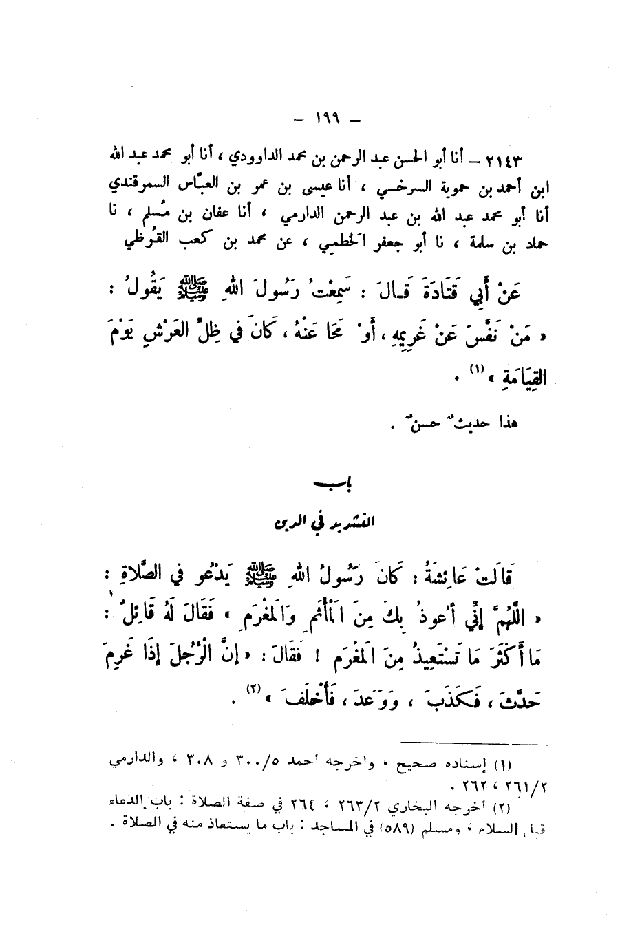 2143 - أَنا أَبُو الْحَسَنِ عَبْدُ الرَّحْمَنِ بْنُ مُحَمَّدٍ الدَّاوُدِيُّ، أَنا أَبُو مُحَمَّدٍ عَبْدُ اللَّهِ بْنُ أَحْمَدَ بْنِ حِمَّوَيْهِ السَّرَخْسِيُّ، أَنا عِيسَى بْنُ عُمَرَ بْنِ الْعَبَّاسِ السَّمَرْقَنْدِيُّ، أَنا أَبُو مُحَمَّدٍ عَبْدُ اللَّهِ بْنُ عَبْدِ الرَّحْمَنِ الدَّارِمِيُّ، أَنا عَفَّانُ بْنُ مُسْلِمٍ، نَا حَمَّادُ بْنُ سَلَمَةَ، نَا أَبُو جَعْفَرٍ الْخَطمِيُّ، عَنْ مُحَمَّدِ بْنِ كَعْبٍ القُرَظِيِّ، عَنْ أَبِي قَتَادَةَ، قَالَ: سَمِعْتُ رَسُولَ اللَّهِ صَلَّى اللهُ عَلَيْهِ وَسَلَّمَ، يَقُولُ: «مَنْ نَفَّسَ عَنْ غَرِيمَهُ، أَوْ مَحَا عَنْهُ، كَانَ فِي ظِلِّ الْعَرْشِ يَوْمَ الْقِيَامَةِ».