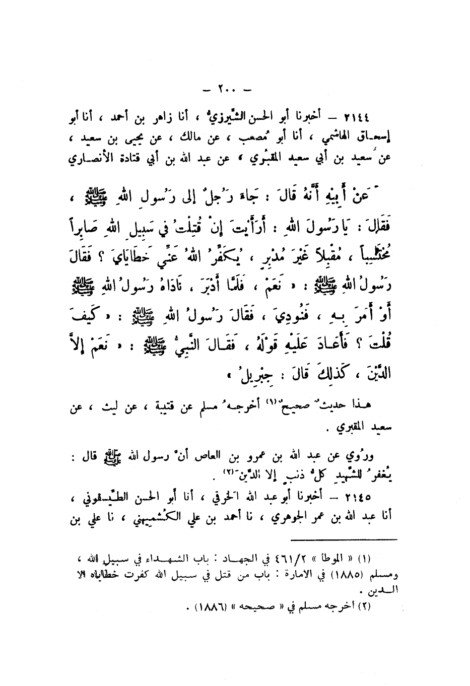 2144 - أَخْبَرَنَا أَبُو الْحَسَنِ الشِّيرَزِيُّ، أَنا زَاهِرُ بْنُ أَحْمَدَ، أَنا أَبُو إِسْحَاقَ الْهَاشِمِيُّ، أَنا أَبُو مُصْعَبٍ، عَنْ مَالِكٍ، عَنْ يَحْيَى بْنِ سَعِيدٍ، عَنْ سَعِيدِ بْنِ أَبِي سَعِيدٍ الْمَقْبُرِيِّ، عَنْ عَبْدِ اللَّهِ بْنِ أَبِي قَتَادَةَ الأَنْصَارِيِّ، عَنْ أَبِيهِ، أَنَّهُ قَالَ: " جَاءَ رَجُلٌ إِلَى رَسُولِ اللَّهِ صَلَّى اللهُ عَلَيْهِ وَسَلَّمَ، فَقَالَ: يَا رَسُولَ اللَّهِ: أَرَأَيْتَ إِنْ قُتِلْتُ فِي سَبِيلِ اللَّهِ صَابِرًا مُحْتَسِبًا، مُقْبِلا غَيْرَ مُدْبِرٍ، يُكَفِّرُ اللَّهُ عَنِّي خَطَايَايَ؟ فَقَالَ رَسُولُ اللَّه صَلَّى اللهُ عَلَيْهِ وَسَلَّمَ: نَعَمْ.