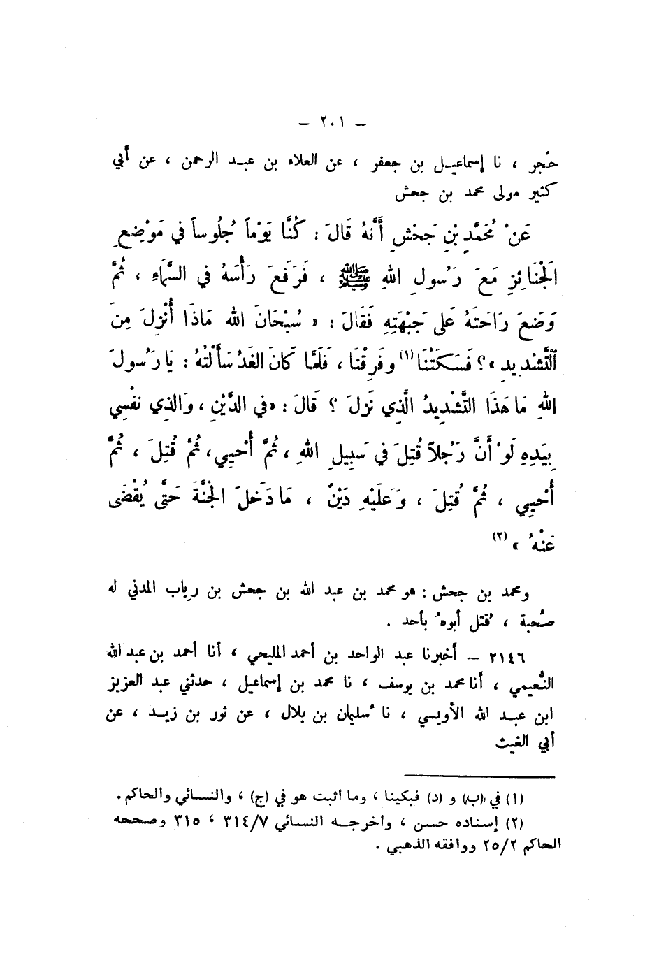 حُجْرٍ، نَا إِسْمَاعِيلُ بْنُ جَعْفَرٍ، عَنِ الْعَلاءِ بْنِ عَبْدِ الرَّحْمَنِ، عَنْ أَبِي كَثِيرٍ مَوْلَى مُحَمَّدِ بْنِ جَحْشٍ، عَنْ مُحَمَّدِ بْنِ جَحْشٍ، أَنَّهُ قَالَ: " كُنَّا يَوْمًا جُلُوسًا فِي مَوْضِعِ الْجَنَائِزِ مَعَ رَسُولِ اللَّهِ صَلَّى اللهُ عَلَيْهِ وَسَلَّمَ، فَرَفَعَ رَأْسَهُ فِي السَّمَاءِ، ثُمَّ وَضَعَ رَاحَتَهُ عَلَى جَبْهَتِهِ، فَقَالَ: سُبْحَانَ اللَّهِ مَاذَا أُنْزِلَ مِنَ التَّشْدِيدِ؟ فَسَكَتْنَا وَفَرِقْنَا، فَلَمَّا كَانَ الْغَدُ سَأَلْتُهُ: يَا رَسُولَ اللَّه، مَا هَذَا التَّشْدِيدُ الَّذِي نَزَلَ؟ قَالَ: فِي الدَّيْنِ، وَالَّذِي نَفْسِي بِيَدِهِ، لَوْ أَنَّ رَجُلا قُتِلَ فِي سَبِيلِ اللَّهِ، ثُمَّ أُحْيِيَ، ثُمَّ قُتِلَ، ثُمَّ أُحْيِيَ، ثُمَّ قُتِلَ، وَعَلَيْهِ دَيْنٌ، مَا دَخَلَ الجَنَّةَ حَتَّى يُقْضَى عَنْهُ ".