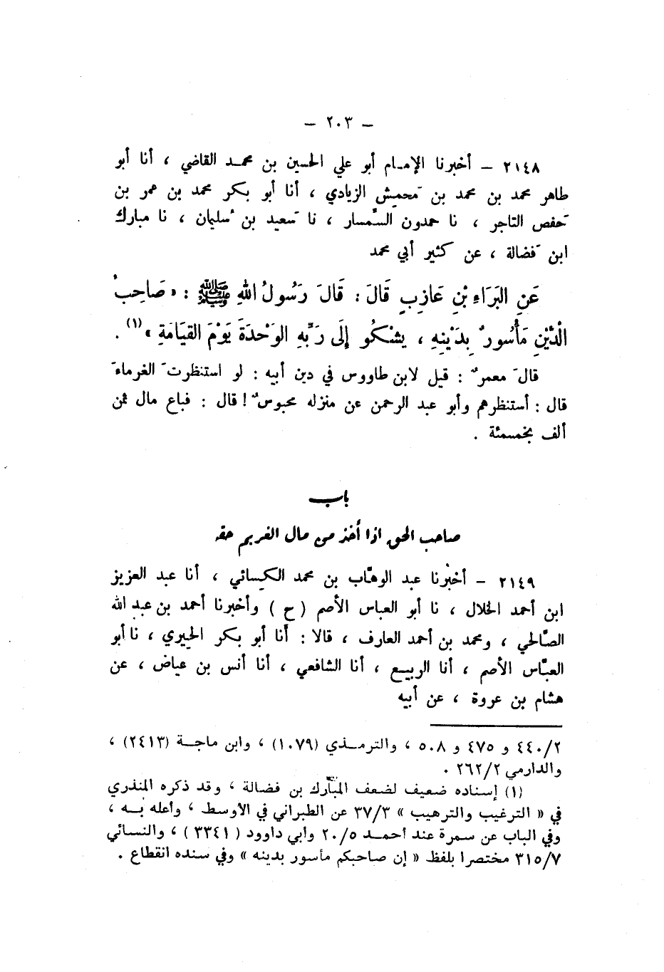 2148 - أَخْبَرَنَا الإِمَامُ أَبُو عَلِيٍّ الْحُسَيْنُ بْنُ مُحَمَّدٍ الْقَاضِي، أَنا أَبُو طَاهِرٍ مُحَمَّدُ بْنُ مُحَمَّدِ بْنِ مَحْمشٍ الزِّيَادِيُّ، أَنا أَبُو بَكْرٍ مُحَمَّدُ بْنُ عُمَرَ بْنِ حَفْصٍ التَّاجِرُ، نَا حَمْدُونُ السِّمْسَارُ، نَا سَعِيدُ بْنُ سُلَيْمَانَ، نَا مُبَارَكُ بْنُ فُضَالَةَ، عَنْ كَثِيرٍ أَبِي مُحَمَّدٍ، عَنِ الْبَرَاءِ بْنِ عَازِبٍ، قَالَ: قَالَ رَسُولُ اللَّهِ صَلَّى اللهُ عَلَيْهِ وَسَلَّمَ: «صَاحِبُ الدَّيْنِ مَأْسُورٌ بِدَيْنِهِ، يَشْكُو إِلَى رَبِّهِ الْوَحْدَةَ يَوْمَ الْقِيَامَةِ».