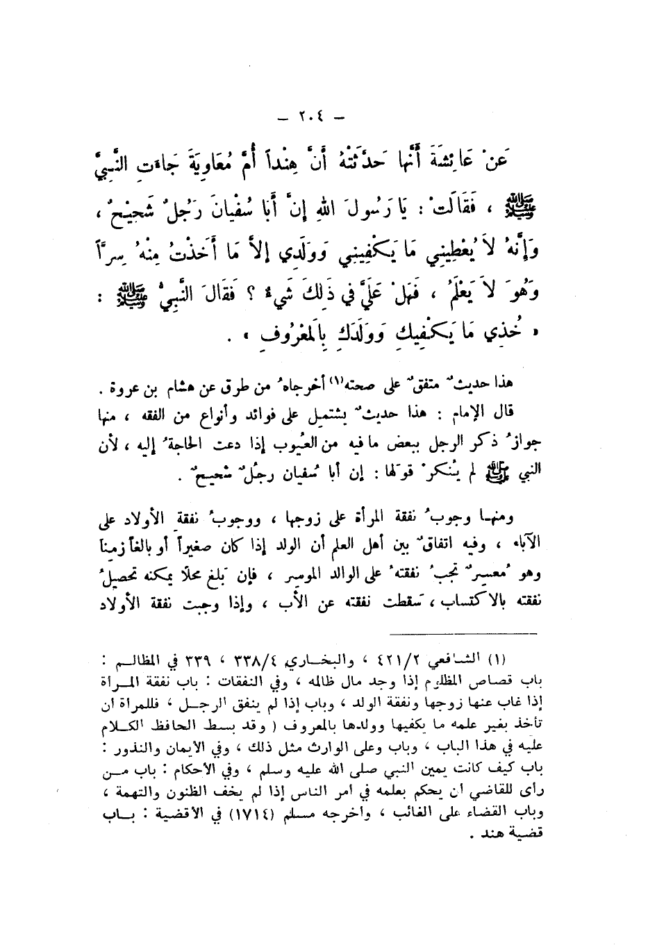 عَنْ عَائِشَةَ، أنَّهَا حَدَّثَتْهُ أَنَّ هِنْدًا أُمَّ مُعَاوِيَةَ جَاءَتِ النَّبِيَّ صَلَّى اللهُ عَلَيْهِ وَسَلَّمَ، فَقَالَتْ: يَا رَسُولَ اللَّهِ، إِنَّ أَبَا سُفْيَانَ رَجُلٌ شَحِيحٌ، وَإِنَّهُ لَا يُعْطِينِي مَا يَكْفِينِي وَوَلَدِي إِلا مَا أَخَذْتُ مِنْهُ سِرًّا وَهُوَ لَا يَعْلَمُ، فَهَلْ عَلَيَّ فِي ذَلِكَ شَيْءٌ؟ فَقَالَ النَّبِيُّ صَلَّى اللهُ عَلَيْهِ وَسَلَّمَ: «خُذِي مَا يَكْفِيكِ وَوَلَدَكِ بِالْمَعْرُوفِ».
