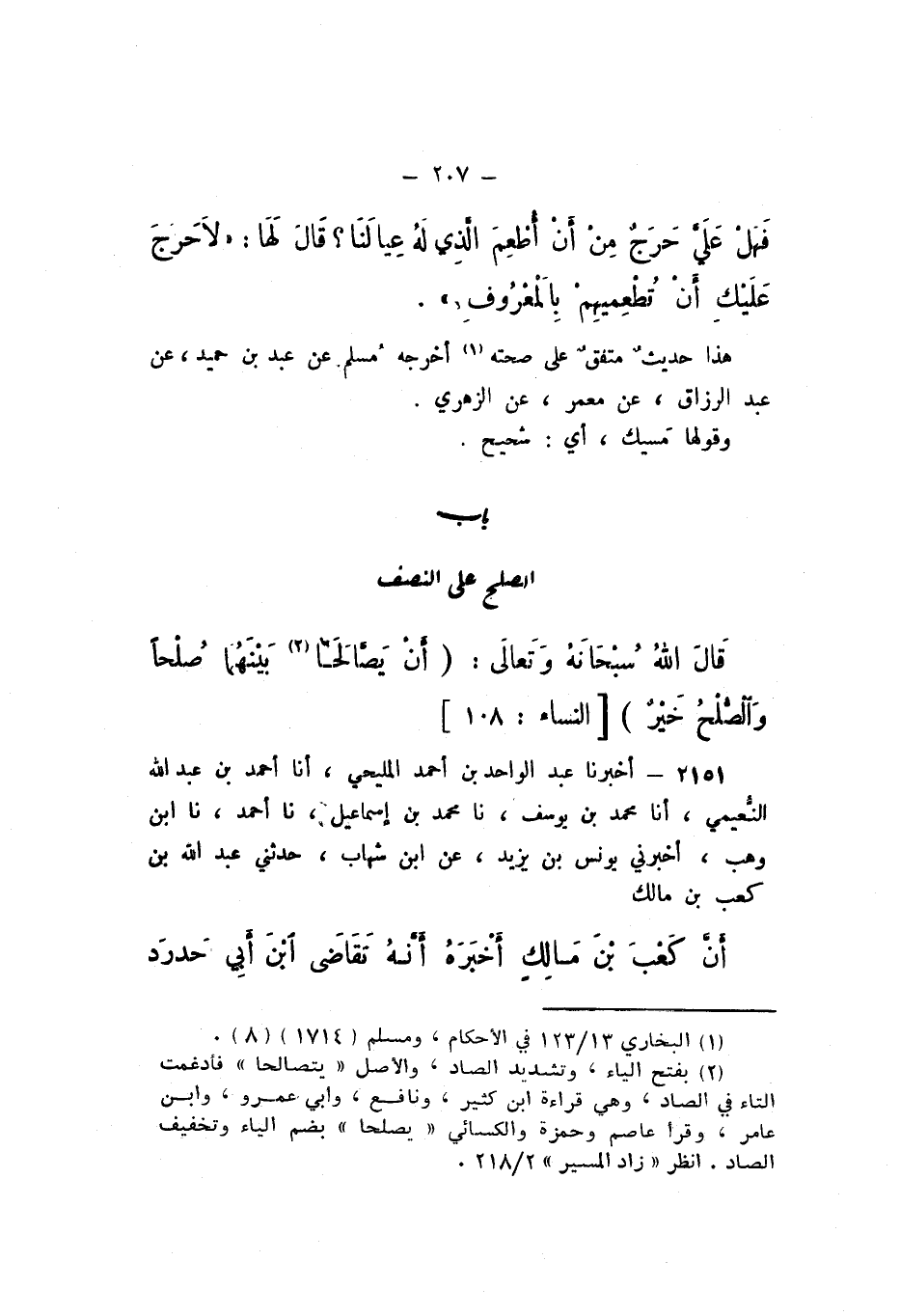 2151 - أَخْبَرَنَا عَبْدُ الْوَاحِدِ بْنُ أَحْمَدَ الْمَلِيحِيُّ، أَنا أَحْمَدُ بْنُ عَبْدِ اللَّهِ النُّعَيْمِيُّ، أَنا مُحَمَّدُ بْنُ يُوسُفَ، نَا مُحَمَّدُ بْنُ إِسْمَاعِيلَ، نَا أَحْمَدُ، نَا ابْنُ وَهْبٍ، أَخْبَرَنِي يُونُسُ بْنُ يَزِيدَ، عَنِ ابْنِ شِهَابٍ، حَدَّثَنِي عَبْدُ اللَّهِ بْنُ كَعْبِ بْنِ مَالِكٍ، أَنَّ كَعْبَ بْنَ مَالِكٍ أَخْبَرَهُ أَنَّهُ تَقَاضَى ابْنُ أَبِي حَدْرَد