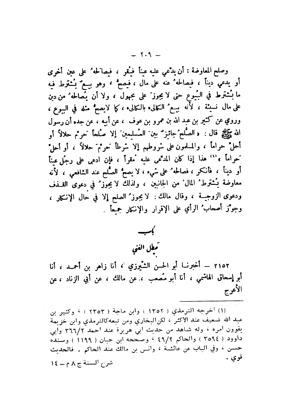 وَصُلْحُ الْمُعَاوَضَةِ: أَنْ يَدَّعِيَ عَلَيْهِ عَيْنًا فَيُقِرُّ، فَيُصَالِحُهُ عَلَى عَيْنٍ أُخْرَى، أَوْ يَدَّعِي دَيْنًا فَيُصَالِحُهُ عَنْهُ عَلَى مَالٍ، فَيَصِحُّ، وَهُوَ بَيْعٌ يُشْتَرَطُ فِيهِ مَا يُشْتَرَطُ فِي الْبُيُوعِ حَتَّى لَا يَجُوزُ عَلَى مَجْهُولٍ، وَلا أَنْ يُصَالِحَهُ مِنْ دَيْنٍ عَلَى مَالٍ نَسِيئَةٍ، لأَنَّهُ بَيْعُ الْكَالِئِ بِالْكَالِئِ، كَمَا لَا يَصِحُّ مِثْلُهُ فِي الْبُيُوعِ، وَرُوِيَ عَنْ كَثِيرِ بْنِ عَبْدِ اللَّهِ بْنِ عَمْرِو بْنِ عَوْفٍ، عَنْ أَبِيهِ، عَنْ جَدِّهِ، أَنَّ رَسُولَ اللَّهِ صَلَّى اللهُ عَلَيْهِ وَسَلَّمَ، قَالَ: «الصُّلْحُ جَائِزٌ بَيْنَ الْمُسْلِمِينَ، إِلا صُلْحًا حَرَّمَ حَلالا أَوْ أَحَلَّ حَرَامًا، والْمُسْلِمُونَ عَلَى شُرُوطِهِم، إِلا شَرْطًا حَرَّمَ حَلالا أَوْ أَحَلَّ حَرَامًا» هَذَا إِذَا كَانَ الْمُدَّعَى عَلَيْهِ مُقِرًّا، فَإِنِ ادَّعَى عَلَى رَجُلٍ عَيْنًا أَوْ دَيْنًا فَأَنْكَرَ، فَصَالَحَهُ عَلَى شَيْءٍ، لَا يَصِحُّ الصُّلْحُ عِنْدَ الشَّافِعِيِّ، لأَنَّهُ مُعَاوَضَةٌ يُشْتَرَطُ الْمَالُ مِنَ الْجَانِبَيْنِ، وَلِذَلِكَ لَا يَجُوزُ فِي دَعْوَى الْقَذْفِ وَدَعْوَى الزَّوْجِيَّةِ، وَقَالَ مَالِكٌ: لَا يَجُوزُ الصُّلْحُ إِلا فِي حَالِ الإِنْكَارِ، وَجَوَّزَ أَصْحَابُ الرَّأْيِ عَلَى الإِقْرَارِ وَالإِنْكَارِ جَمِيعًا.