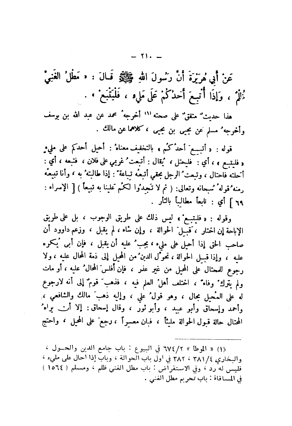 عَنْ أَبي هُرَيْرَةَ، أَنَّ رَسُولَ اللَّهِ صَلَّى اللهُ عَلَيْهِ وَسَلَّمَ، قَالَ: «مَطْلُ الغَنِيِّ ظُلْمٌ، وَإِذَا أُتْبِعَ أَحَدُكُمْ عَلَى مَلِئٍ، فَلْيَتْبَعْ».