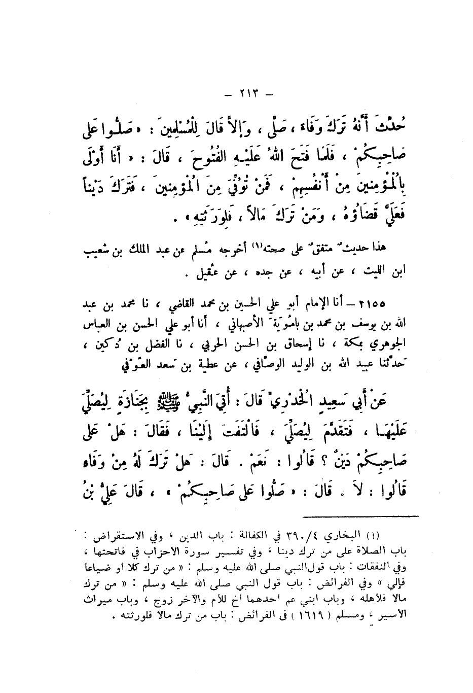 2155 - أَنا الإِمَامُ أَبُو عَلِيٍّ الْحُسَيْنُ بْنُ مُحَمَّدٍ الْقَاضِي، نَا مُحَمَّدُ بْنُ عَبْدِ اللَّهِ بْنِ يُوسُفَ بْنِ مُحَمَّدِ بْنِ بَامُوَيْهِ الأَصْبَهَانِيُّ، أَنا أَبُو عَلِيٍّ الْحَسَنُ بْنُ الْعَبَّاسِ الْجَوْهَرِيُّ، بِمَكَّةَ، نَا إِسْحَاقُ بْنُ الْحَسَنِ الْحَرْبِيُّ، نَا الْفَضْلُ بْنُ دُكَيْنٍ، حَدَّثَنَا عُبَيْدُ اللَّهِ بْنُ الْوَلِيدِ الْوَصَّافِيُّ، عَنْ عَطِيَّةَ بْنِ سَعْدٍ الْعَوْفِيِّ، عَنْ أَبِي سَعِيدٍ الْخُدْرِيِّ، قَالَ: أُتِيَ النَّبِيُّ صَلَّى اللهُ عَلَيْهِ وَسَلَّمَ بِجَنَازَةٍ لِيُصَلِّيَ عَلَيْهَا، فَتَقَدَّمَ لِيُصَلِّيَ، فَالْتَفَتَ إِلَيْنَا، فَقَالَ: «هَلْ عَلَى صَاحِبُكُمْ دَيْنٌ؟» قَالُوا: نَعَمْ.