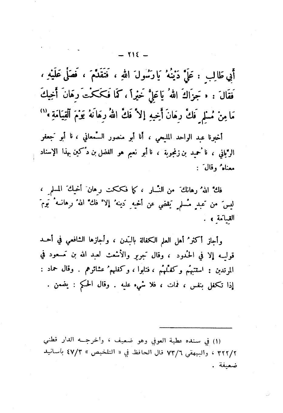 أَبِي طَالِبٍ: عَلَيَّ دَيْنُهُ يَا رَسُولَ اللَّهِ، فَتَقَدَّمَ، فَصَلَّى عَلَيْهِ، فَقَالَ: «جَزَاكَ اللَّهُ يَا عَلِيُّ خَيْرًا، كَمَا فَكَكْتَ رِهَانَ أَخِيكَ، مَا مِنْ مُسْلِمٍ فَكَّ رِهَانَ أَخِيهِ إِلا فَكَّ اللَّهُ رِهَانَهُ يَوْمَ الْقِيَامَةِ».