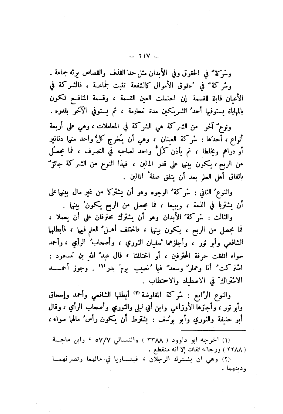 وَنَوْعٌ آخَرُ مِنَ الشَّرِكَةِ هِيَ الشَّرِكَةُ فِي الْمُعَامَلاتِ، وَهِيَ عَلَى أَرْبَعَةِ أَنْوَاعٍ، أَحَدُهُمَا: شَرِكَةُ الْعِنَانِ، وَهِيَ أَنْ يُخْرِجَ كُلُّ وَاحِدٍ مِنْهُمَا دَنَانِيرَ أَوْ دَرَاهِمَ وَيَخْلِطَا، ثُمَّ يَأْذَنُ كُلُّ وَاحِدٍ لِصَاحِبِهِ فِي التَّصَرُّفِ، فَمَا يَحْصُلُ مِنَ الرِّبْحِ، يَكُونُ بَيْنَهُمَا عَلَى قَدْرِ الْمَالَيْنِ، فهَذَا النَّوْعُ مِنَ الشَّرِكَةِ جَائِزٌ بِاتِّفَاقِ أَهْلِ الْعِلْمِ بَعْدَ أَنْ يَتَّفِقَ صِفَةُ الْمَالَيْنِ.