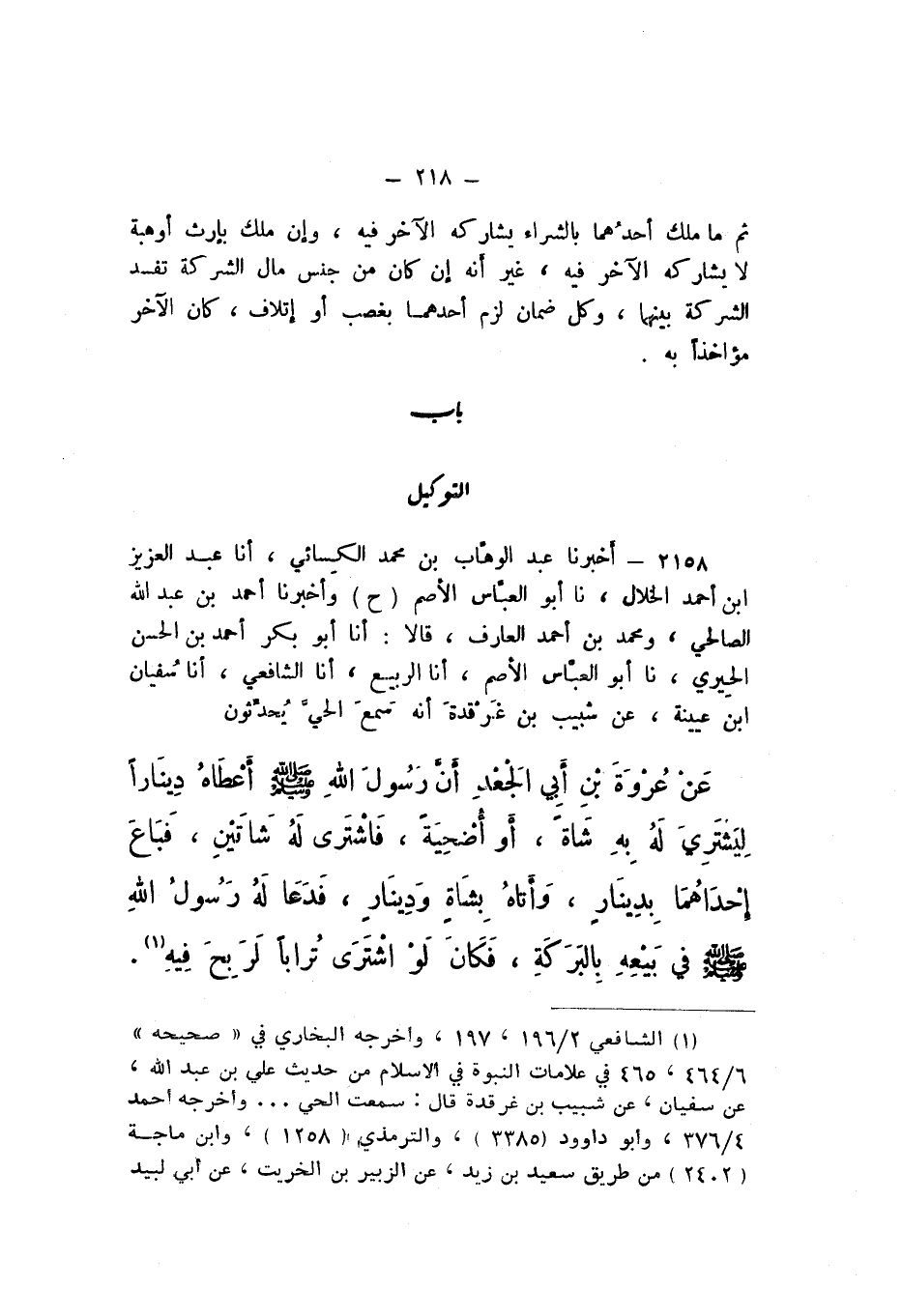 ح وَأَخْبَرَنَا أَحْمَدُ بْنُ عَبْدِ اللَّهِ الصَّالِحِيُّ، وَمُحَمَّدُ بْنُ أَحْمَدَ الْعَارِفُ، قَالا: أَنا أَبُو بَكْرٍ أَحْمَدُ بْنُ الْحَسَنِ الْحِيرِيُّ، نَا أَبُو الْعَبَّاسِ الأَصَمُّ، أَنا الرَّبِيعُ، أَنا الشَّافِعِيُّ، أَنا سُفْيَانُ بْنُ عُيَيْنَةَ، عَنْ شَبِيبِ بْنِ غَرْقَدَةَ، أَنَّهُ سَمِعَ الْحَيَّ يُحَدِّثُونَ عَنْ عُرْوَةَ بْنِ أَبِي الْجَعْدِ، «أَنَّ رَسُولَ اللَّهِ صَلَّى اللهُ عَلَيْهِ وَسَلَّمَ، أَعْطَاهُ دِينَارًا لِيَشْتَريَ لَهُ بِهِ شَاةً، أَوْ أُضحِيَةً، فَاشْتَرَى لَهُ شَاتَيْنِ، فَبَاعَ إِحْدَاهُمَا بِدِينَارٍ، وَأَتَاهُ بِشَاةٍ وَدِينَارٍ، فَدَعَا لَهُ رَسُولُ اللَّهِ صَلَّى اللهُ عَلَيْهِ وَسَلَّمَ فِي بَيْعِهِ بِالْبَرَكَةِ، فَكَانَ لَوِ اشْتَرَى تُرَابًا لَرَبِحَ فِيهِ».