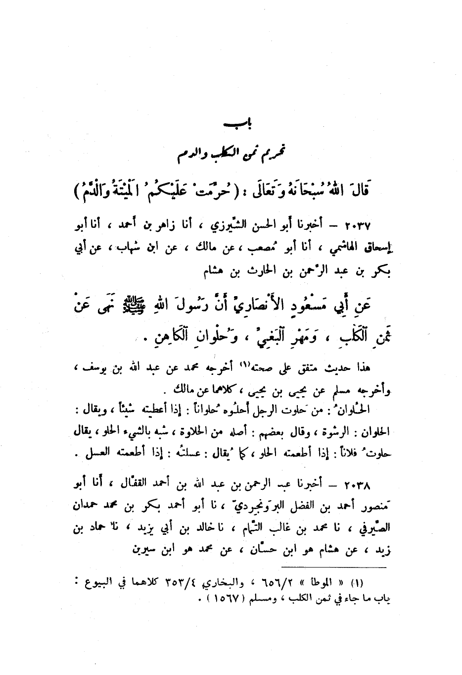 2037 - أَخْبَرَنَا أَبُو الْحَسَنِ الشِّيرَزِيُّ، أَنا زَاهِرُ بْنُ أَحْمَدَ، أَنا أَبُو إِسْحَاقَ الْهَاشِمِيُّ، أَنا أَبُو مُصْعَبٍ، عَنْ مَالِكٍ، عَنِ ابْنِ شِهَابٍ، عَنْ أَبِي بَكْرِ بْنِ عَبْدِ الرَّحْمَنِ بْنِ الْحَارِثِ بْنِ هِشَامٍ، عَنْ أَبِي مَسْعُودٍ الأنْصَارِيِّ: أَنَّ رَسُولَ اللَّهِ صَلَّى اللهُ عَلَيْهِ وَسَلَّمَ «نَهَى عَنْ ثَمَنِ الْكَلْبِ، وَمَهْرِ الْبَغِيِّ، وَحُلْوَانِ الْكَاهِنِ».