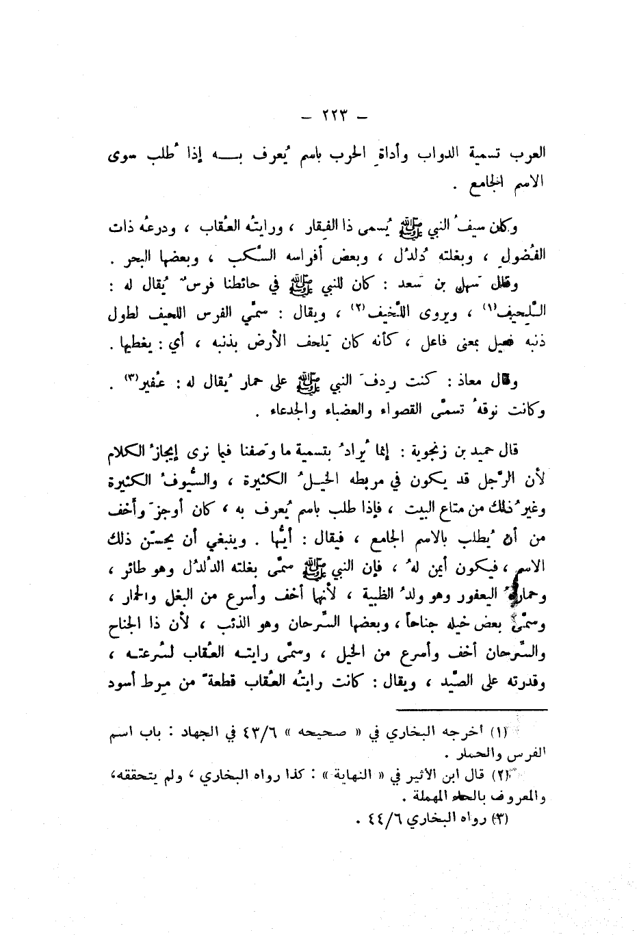 قَالَ حُمَيْدُ بْنُ زَنْجُوَيْهِ: إِنَّمَا يُرَادُ بِتَسْمِيَةِ مَا وَصَفْنَا فِيمَا نَرَى إِيجَازُ الْكَلامِ، لأَنَّ الرَّجُلَ قَدْ يَكُونُ فِي مَرْبَطِهِ الْخَيْلُ الْكَثِيرَةُ، وَالسُّيُوفُ الْكَثِيرَةُ وَغَيْرُ ذَلِكَ مِنْ مَتَاعِ الْبَيْتِ، فَإِذَا طُلِبَ بِاسْمٍ يُعْرَفُ بِهِ كَانَ أَوْجَزَ وَأَخَفَّ مِنْ أَنْ يُطْلَبَ بِالاسْمِ الْجَامِعِ، فَيُقَالُ: أَيُّهَا؟ وَيَنْبَغِي أَنْ يُحْسِنَ ذَلِكَ الاسْمَ، فَيَكُونُ أَيْمَنَ لَهُ، فَإِنَّ النَّبِيَّ صَلَّى اللهُ عَلَيْهِ وَسَلَّمَ سَمَّى بَغْلَتَهُ الدُّلْدُلَ، وَهُوَ طَائِرٌ، وَحِمَارَهُ الْيُعْفُورَ وَهُوَ وَلَدُ الظَّبْيَةِ، لأَنَّهُمَا أَخَفُ وَأَسْرَعُ مِنَ الْبَغْلِ وَالْحِمَارِ، وَسَمَّى بَعْضَ خَيْلِهِ جَنَاحًا، وَبَعْضَهَا السِّرْحَانَ وَهُوَ الذِّئْبُ، لأَنَّ ذَا الْجَنَاحِ وَالسِّرْحَانِ أَخَفُ وَأَسْرَعُ مِنَ الْخَيْلِ، وَسَمَّى رَايَتَهُ الْعُقَابَ لِسُرْعَتِهِ، وَقُدْرَتِهِ عَلَى الصِّيدِ، وَيُقَالُ: كَانَتْ رَايَتُهُ الْعُقَابُ قِطْعَةً مِنْ مِرْطٍ أَسْوَدَ،
