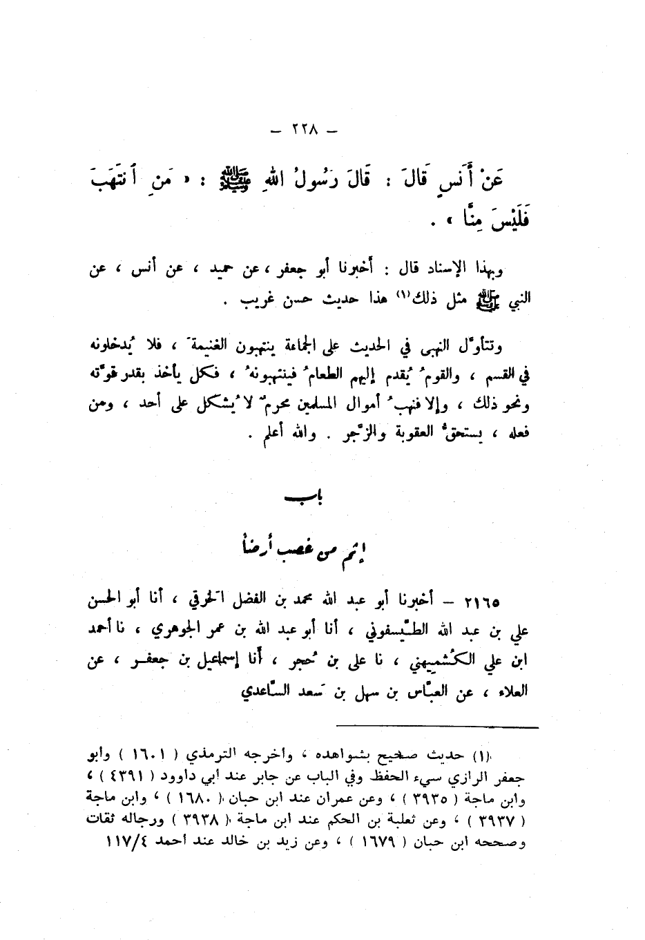 عَنْ أَنَسٍ، قَالَ: قَالَ رَسُولُ اللَّهِ صَلَّى اللهُ عَلَيْهِ وَسَلَّمَ: «مَنِ انْتَهَبَ فَلَيْسَ مِنَّا».
