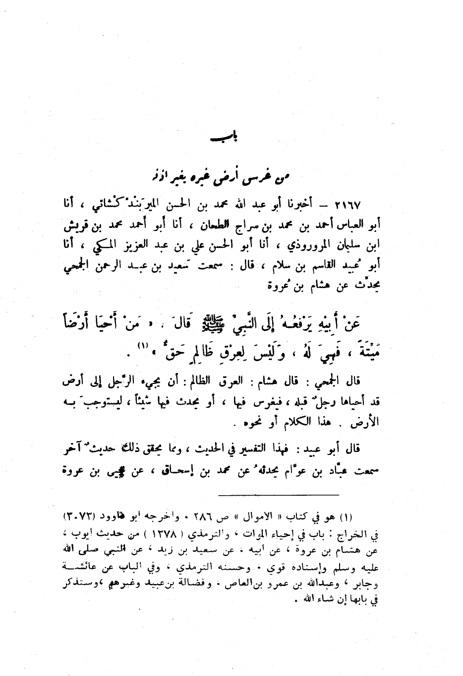 2167 - أَخْبَرَنَا أَبُو عَبْدِ اللَّهِ بْنُ الْحَسَنِ الْمَيْرَبَنْدِ كُشَائِيُّ، أَنا أَبُو الْعَبَّاسِ أَحْمَدُ بْنُ مُحَمَّدِ بْنِ سِرَاجٍ الطَّحَّانُ، أَنا أَبُو أَحْمَدَ مُحَمَّدُ بْنُ قُرَيْشِ بْنِ سُلَيْمَانَ الْمَرْوَرَذِيُّ، أَنا أَبُو الْحَسَنِ عَلِيُّ بْنُ عَبْدِ الْعَزِيزِ الْمَكِّيُّ، أَنا أَبُو عُبَيْدٍ الْقَاسِمُ بْنُ سَلامٍ، قَالَ: سَمِعْتُ سَعِيدَ بْنَ عَبْدِ الرَّحْمَنِ الْجُمَحِيَّ يُحَدِّثُ، عَنْ هِشَامِ بْنِ عُرْوَةَ، عَنْ أَبِيهِ، يَرْفَعُهُ إِلَى النَّبِيِّ صَلَّى اللهُ عَلَيْهِ وَسَلَّمَ، قَالَ: «مَنْ أَحْيَا أَرْضًا مَيِّتَةً، فَهِيَ لَهُ، وَلَيْسَ لِعِرْقِ ظَالِمٍ حَقٌّ».