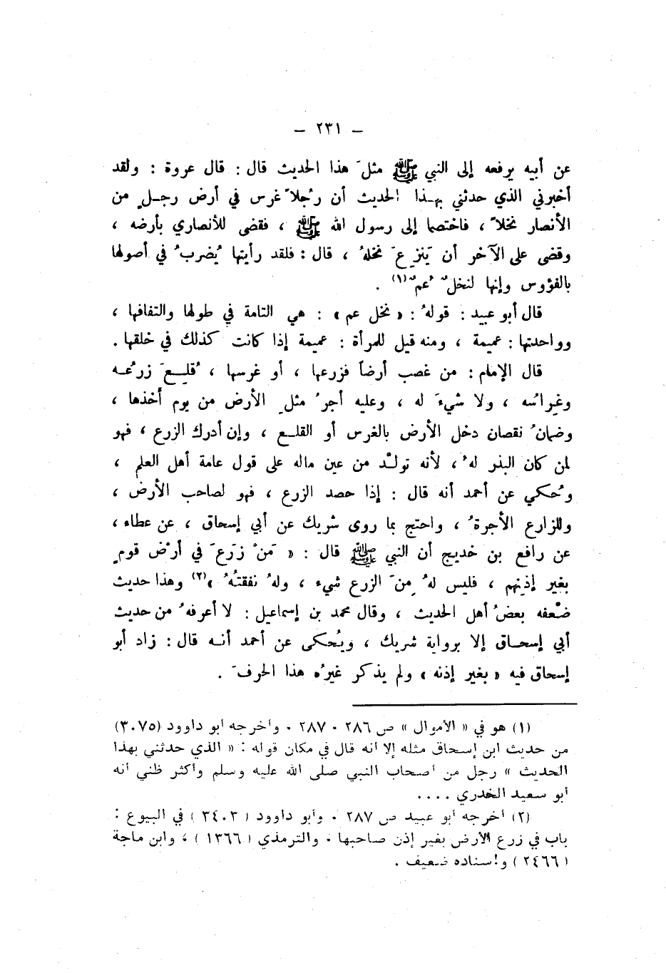 قَالَ الإِمَامُ: مَنْ غَصَبَ أَرْضًا فَزَرَعَهَا أَوْ غَرَسَهَا، قُلِعَ زَرْعُهُ وَغِرَاسُهُ، وَلا شَيْءَ لَهُ، وَعَلَيْهِ أَجْرُ مِثْلِ الأَرْضِ مِنْ يَوْمِ أَخْذِهَا، وَضَمَانُ نُقْصَانِ دَخْلِ الأَرْضِ بِالْغَرْسِ أَوِ الْقَلْعِ، وَإِنْ أَدْرَكَ الزَّرْعَ، فَهُوَ لِمَنْ كَانَ الْبِذْرُ لَهُ، لأَنَّهُ تَوَلَّدَ مِنْ عَيْنِ مَالِهِ، عَلَى قَوْلِ عَامَّةِ أَهْلِ الْعِلْمِ، وَحُكِيَ عَنْ أَحْمَدَ، أَنَّهُ قَالَ: إِذَا حُصِدَ الزَّرْعُ، فَهُوَ لِصَاحِبِ الأَرْضِ، وَلِلزَّارِعِ الأُجْرَةُ، وَاحْتَجَّ بِمَا رَوَى شَرِيكٌ، عَنْ أَبِي إِسْحَاقَ، عَنْ عَطَاءٍ، عَنْ رَافِعِ بْنِ خَدِيجٍ، أَنَّ النَّبِيَّ صَلَّى اللهُ عَلَيْهِ وَسَلَّمَ، قَالَ: «مَنْ زَرَعَ فِي أَرْضِ قَوْمٍ بِغَيْرِ إِذْنِهِمْ، فَلَيْسَ لَهُ مِنَ الزَّرْعِ شَيْءٌ، وَلَهُ نَفَقَتُهُ»، وَهَذَا حَدِيثٌ ضَعَّفَهُ بَعْضُ أَهْلِ الْحَدِيثِ، وَقَالَ مُحَمَّدُ بْنُ إِسْمَاعِيلَ: لَا أَعْرِفُهُ مِنْ حَدِيثِ أَبِي إِسْحَاقَ إِلا بِرِوَايَةِ شَرِيكٍ، وَيُحْكَى، عَنْ أَحْمَدَ، أَنَّهُ قَالَ: زَادَ أَبُو إِسْحَاقَ فِيهِ «بِغَيْرِ إِذْنِهِ» وَلَمْ يَذْكُرْ غَيْرُهُ هَذَا الْحَرْفَ.