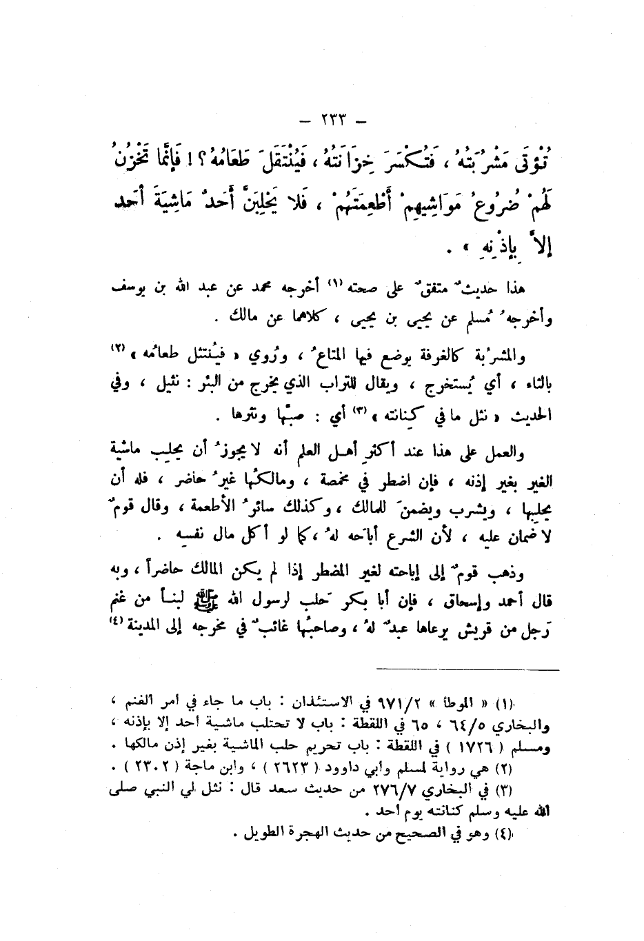 وَالْعَمَلُ عَلَى هَذَا عِنْدَ أَكْثَرِ أَهْلِ الْعِلْمِ، أَنَّهُ لَا يَجُوزُ أَنْ يَحْلِبَ مَاشِيَةَ الْغَيْرِ بِغَيْرِ إِذْنِهِ، فَإِنِ اضْطُرَّ فِي مَخْمَصَةٍ، وَمَالِكُهَا غَيْرُ حَاضِرٍ، فَلَهُ أَنْ يَحْلِبَهَا وَيَشْرَبَ وَيَضْمَنَ لِلْمَالِكِ، وَكَذَلِكَ سَائِرُ الأَطْعِمَةِ، وَقَالَ قَوْمٌ: لَا ضَمَانَ عَلَيْهِ، لأَنَّ الشَّرْعَ أَبَاحَهُ لَهُ، كَمَا لَوْ أَكَلَ مَالَ نَفْسِهِ.