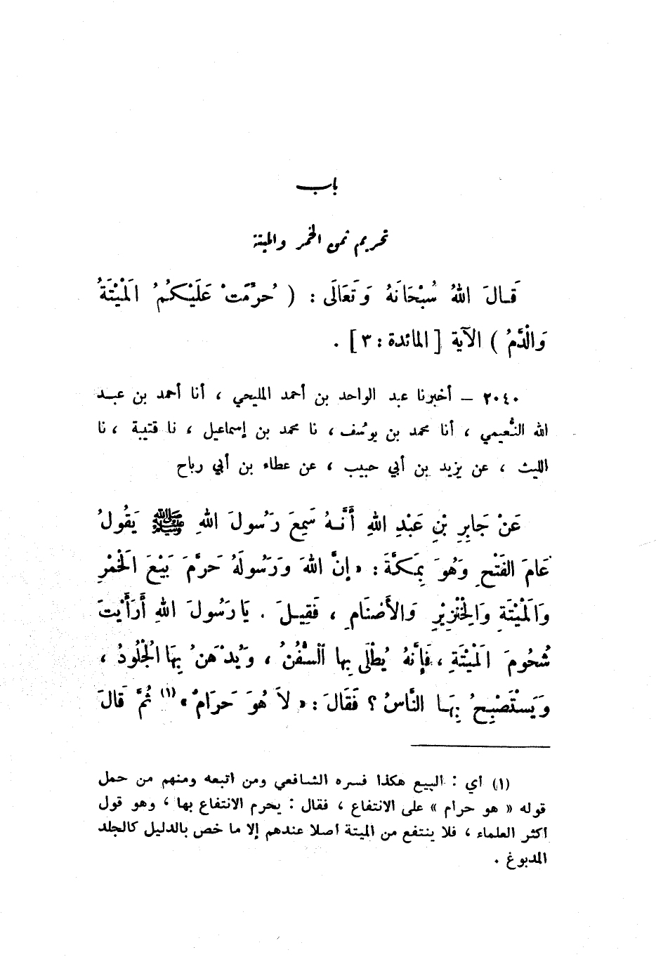 2040 - أَخْبَرَنَا عَبْدُ الْوَاحِدِ بْنُ أَحْمَدَ الْمَلِيحِيُّ، أَنا أَحْمَدُ بْنُ عَبْدِ اللَّهِ النُّعَيْمِيُّ، أَنا مُحَمَّدُ بْنُ يُوسُفَ، نَا مُحَمَّدُ بْنُ إِسْمَاعِيلَ، نَا قُتَيْبَةُ، نَا اللَّيْثُ، عَنْ يَزِيدَ بْنِ أَبِي حَبِيبٍ، عَنْ عَطَاءِ بْنِ أَبِي رَبَاحٍ، عَنْ جَابِرِ بْنِ عَبْدِ اللَّهِ، أَنَّهُ سَمِعَ رَسُولَ اللَّهِ صَلَّى اللهُ عَلَيْهِ وَسَلَّمَ، يَقُولَ عَامَ الْفَتْحِ وَهُوَ بِمَكَةَ: «إِنَّ اللَّهَ وَرَسُولَهُ حَرَّمَ بَيْعَ الْخَمْرِ، وَالْمَيْتَةَ، وَالْخِنْزِيرَ، وَالأَصْنَامَ».