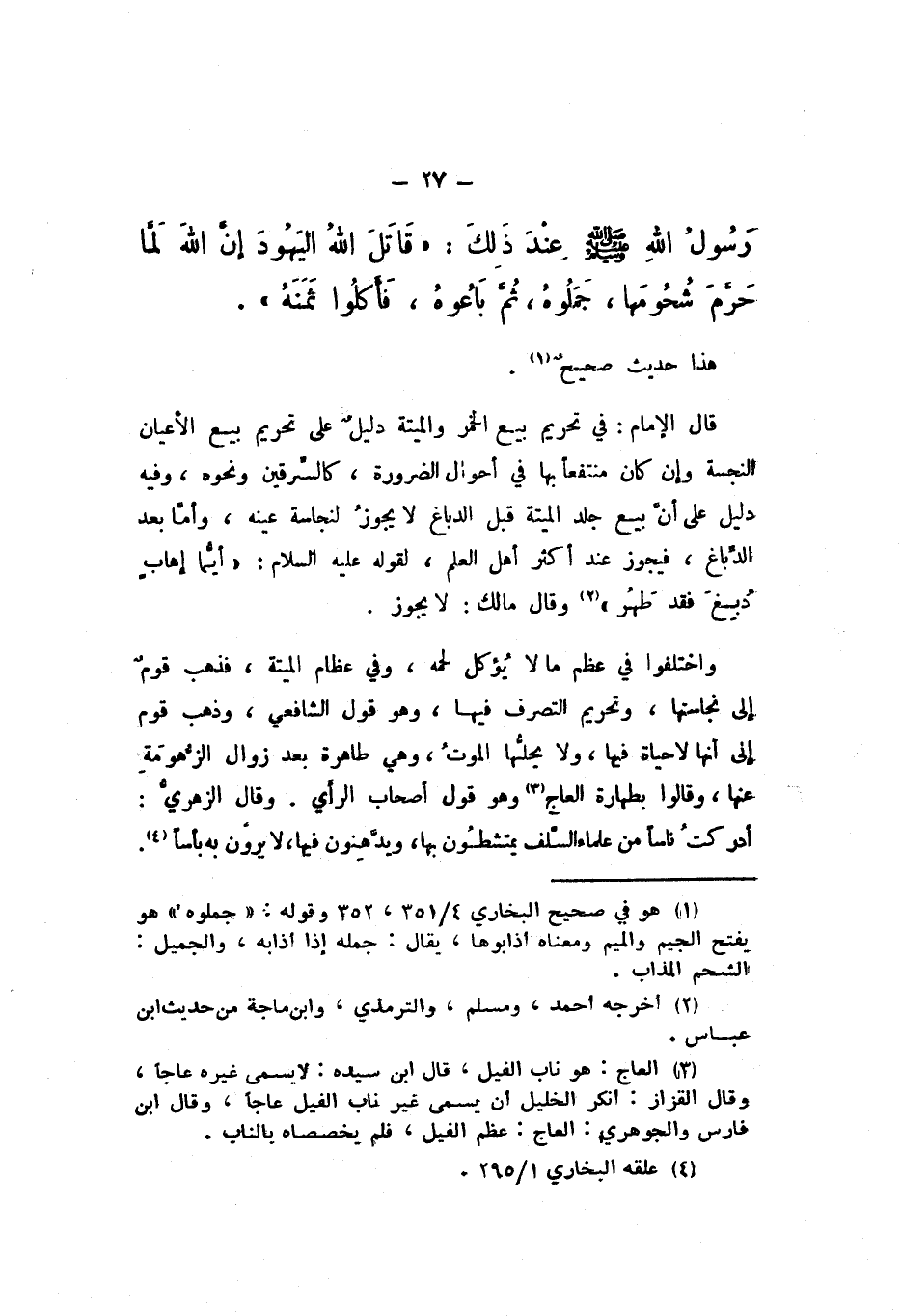 رَسُولُ اللَّهِ صَلَّى اللهُ عَلَيْهِ وَسَلَّمَ عِنْدَ ذَلِكَ: «قَاتَلَ اللَّهُ الْيَهُودَ، إِنَّ اللَّهَ لَمَّا حَرَّمَ شُحُومَهَا جَمَلُوهُ ثُمَّ بَاعُوهُ، فَأَكَلُوا ثَمَنَهُ».