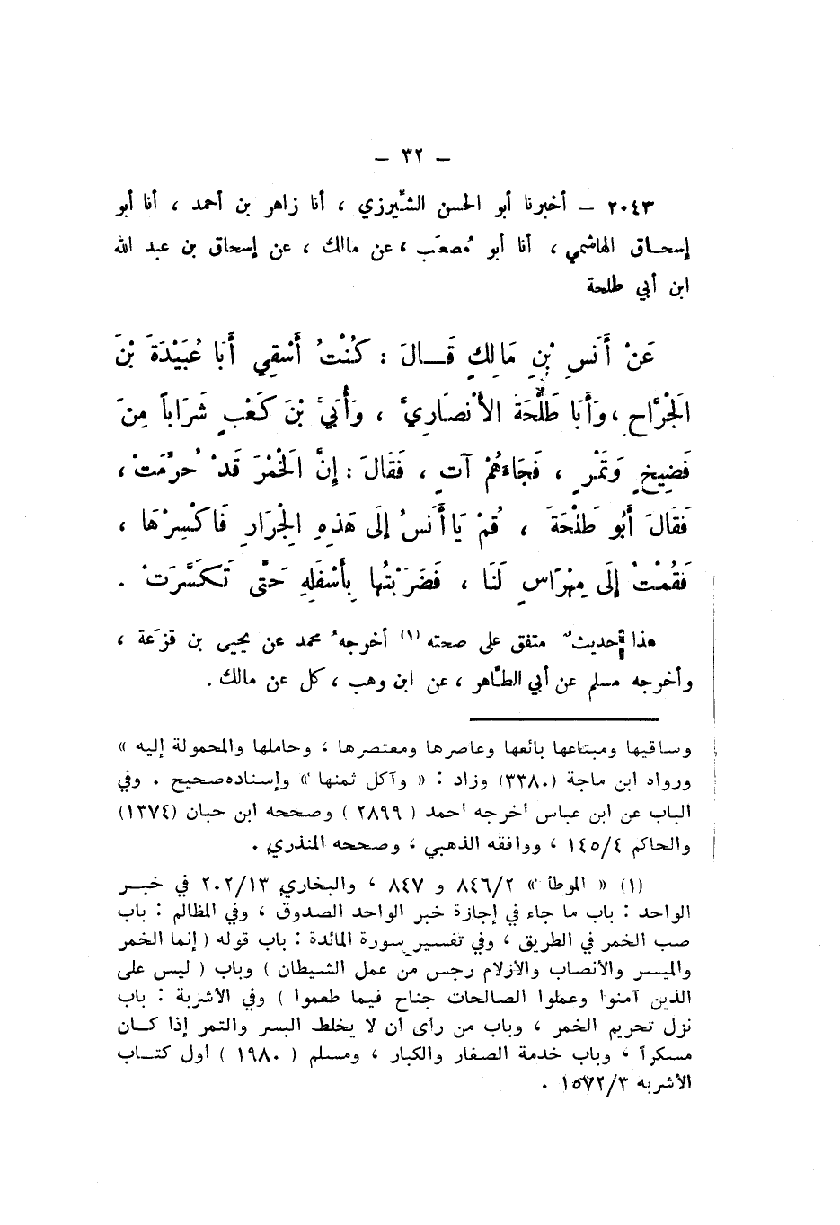 2043 - أَخْبَرَنَا أَبُو الْحَسَنِ الشِّيرَزِيُّ، أَنا زَاهِرُ بْنُ أَحْمَدَ، أَنا أَبُو إِسْحَاقَ الْهَاشِمِيُّ، أَنا أَبُو مُصعَبٍ، عَنْ مَالِكٍ، عَنْ إِسْحَاقَ بْنِ عَبْدِ اللَّهِ بْنِ أَبِي طَلْحَةَ، عَنْ أَنَسِ بْنِ مَالِكٍ، قَالَ: كُنْتُ أَسْقِي أبَا عُبَيْدَةَ بْنَ الْجَرَّاحِ، وَأبَا طَلْحَةَ الأَنْصَارِيَّ، وَأُبَيَّ بْنَ كَعْبٍ، شَرَابًا مِنْ فَضِيخٍ وَتَمْرٍ، فَجَاءَهُمُ آتٍ، فَقَالَ: إِنَّ الخَمْرَ قَدْ حُرِّمَتْ.