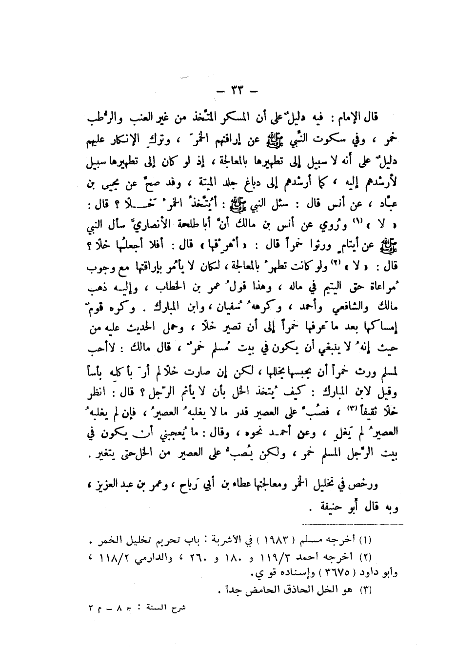 وَرُوِيَ عَنْ أَنَسِ بْنِ مَالِكٍ أَنَّ أَبَا طَلْحَةَ الأَنْصَارِيَّ سَأَلَ النَّبِيَّ صَلَّى اللهُ عَلَيْهِ وَسَلَّمَ عَنْ أَيْتَامٍ وَرِثُوا خَمْرًا؟ قَالَ: «أَهْرِقْهَا» قَالَ: أَفَلا أَجْعَلُهَا خَلا؟ قَالَ: «لَا».