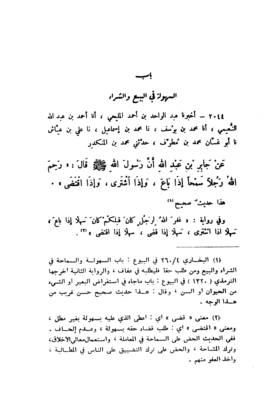 2044 - أَخْبَرَنَا عَبْدُ الْوَاحِدِ بْنُ أَحْمَدَ الْمَلِيحِيُّ، أَنا أَحْمَدُ بْنُ عَبْدِ اللَّهِ النُّعَيْمِيُّ، أَنا مُحَمَّدُ بْنُ يُوسُفَ، نَا مُحَمَّدُ بْنُ إِسْمَاعِيلَ، نَا عَلِيُّ بْنُ عَيَّاشٍ، نَا أَبُو غَسَّانَ مُحَمَّدُ بْنُ مُطَرِّفٍ، حدَّثني مُحَمَّدُ بْنُ الْمُنْكَدِرِ، عَنْ جَابِرِ بْنِ عَبْدِ اللَّهِ، أَنّ رَسُولَ اللَّه صَلَّى اللهُ عَلَيْهِ وَسَلَّمَ، قَالَ: «رَحِمَ اللَّهُ رَجُلا سَمْحًا إِذَا بَاعَ، وَإِذَا اشْتَرَى، وَإِذَا اقْتَضَى».