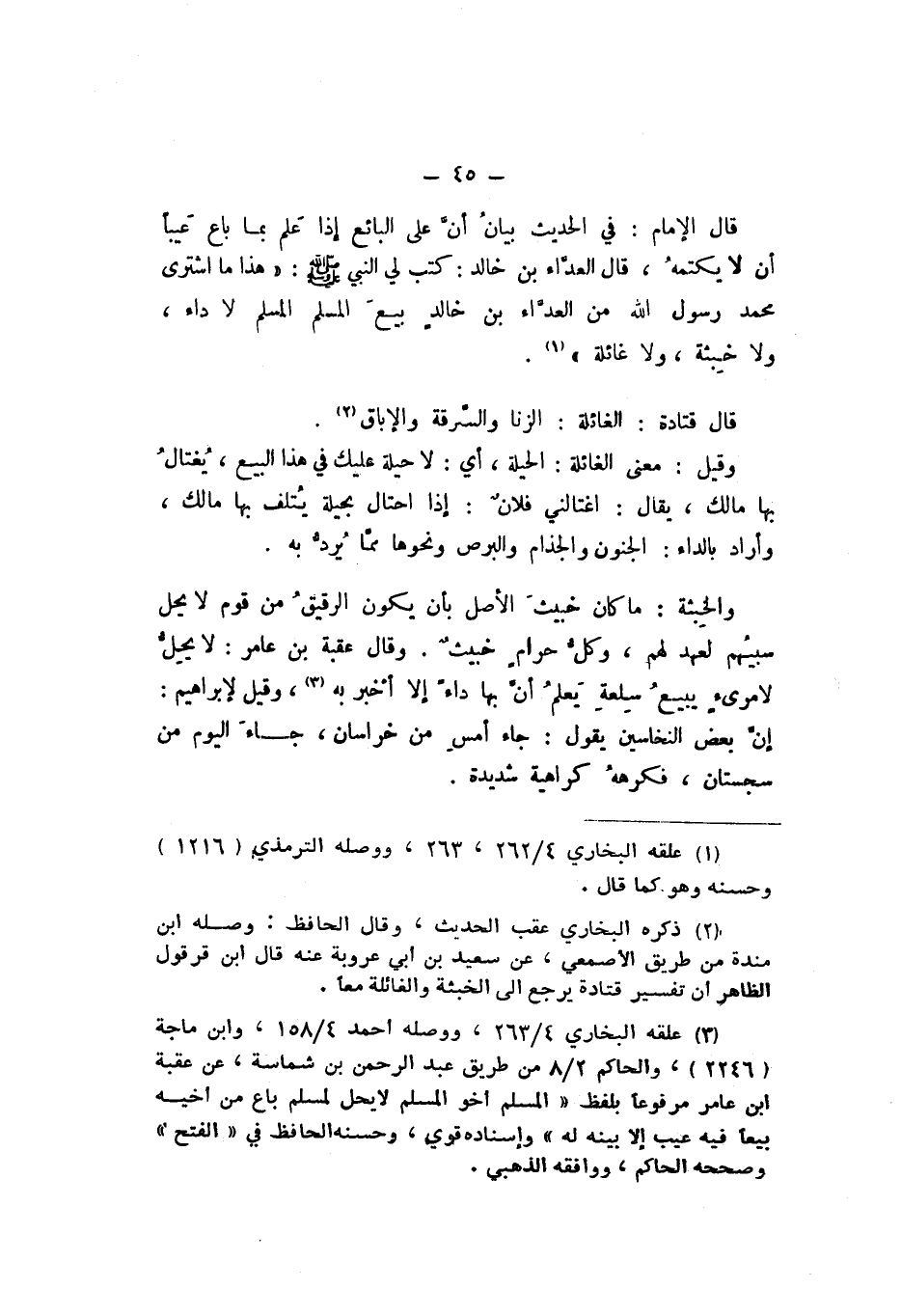قَالَ الْعَدَّاءُ بْنُ خَالِدٍ: كَتَبَ لِي النَّبِيُّ صَلَّى اللهُ عَلَيْهِ وَسَلَّمَ: «هَذَا مَا اشْتَرَى مُحَمَّدٌ رَسُولُ اللَّهِ مِنَ الْعَدَّاءِ بْنِ خَالِدٍ، بَيْعَ الْمُسْلِمِ الْمُسْلِمَ، لَا دَاءَ وَلا خَبِثَةَ وَلا غَائِلَةَ».