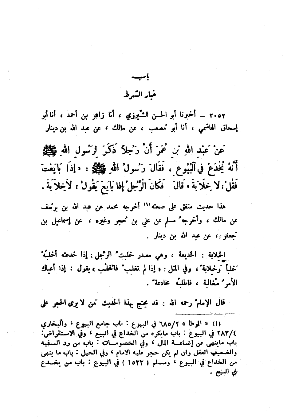 2052 - أَخْبَرَنَا أَبُو الْحَسَنِ الشِّيرَزِيُّ، أَنا زَاهِرُ بْنُ أَحْمَدَ، أَنا أَبُو إِسْحَاقَ الْهَاشِمِيُّ، أَنا أَبُو مُصْعَبٍ، عَنْ مَالِكٍ، عَنْ عَبْدِ اللَّهِ بْنِ دِينَارٍ، عَنْ عَبْدِ اللَّهِ بْنِ عُمَرَ، أَنَّ رَجُلا ذَكَرَ لِرَسُولِ اللَّه صَلَّى اللهُ عَلَيْهِ وَسَلَّمَ، أَنَّهُ يُخْدَعُ فِي البُيُوع، فَقَالَ رَسُولُ اللَّهِ صَلَّى اللهُ عَلَيْهِ وَسَلَّمَ: " إذَا بَايَعْتَ فَقُلْ: لَا خِلابَةَ ".