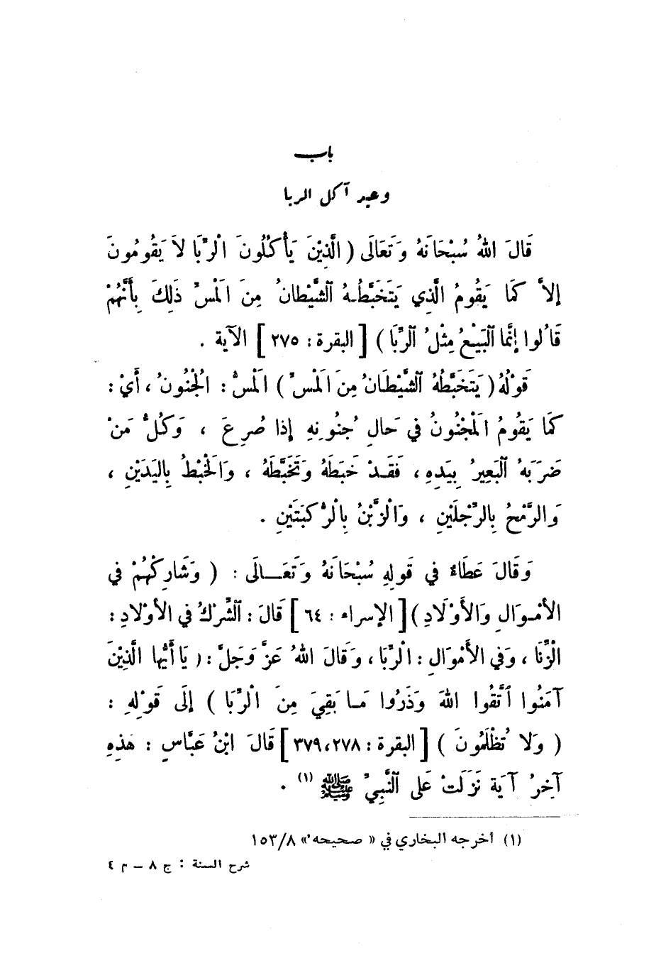 قَالَ اللَّهُ سُبْحَانَهُ وَتَعَالَى: {الَّذِينَ يَأْكُلُونَ الرِّبَا لَا يَقُومُونَ إِلا كَمَا يَقُومُ الَّذِي يَتَخَبَّطُهُ الشَّيْطَانُ مِنَ الْمَسِّ ذَلِكَ بِأَنَّهُمْ قَالُوا إِنَّمَا الْبَيْعُ مِثْلُ الرِّبَا} [الْبَقَرَة: 275] الآيَةَ.