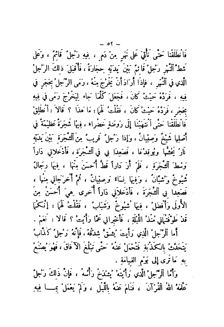 فَانْطَلَقْنَا حَتَّى انْتَهَيْنَا إِلَى رَوْضَةٍ خَضْرَاءَ، فِيهَا شَجَرَةٌ عَظِيمَةٌ فِي أَصْلِهَا شَيْخٌ وَصِبْيَانٌ، وَإِذَا رَجُلٌ قَرِيبٌ مِنَ الشَّجَرَةِ بَيْنَ يَدَيْهِ نَارٌ يَحُشُّهَا وَيُوقِدُهَا، فَصَعِدَا بِي فِي الشَّجَرَةِ فَأَدْخَلانِي دَارًا وَسْطَ الشَّجَرَةِ، فَلَمْ أَرَ دَارًا قَطُّ أَحْسَنَ مِنْهَا، فِيهَا رِجَالٌ شُيُوخٌ وَشُبَّانٌ، وَفِيهَا نِسَاءٌ وَصِبْيَانٌ، ثُمَّ أَخْرَجَانِي مِنْهَا، فَصَعِدَا بِيَ الشَّجَرَةَ فَأَدْخَلانِي دَارًا أُخْرَى هِيَ أَحْسَنُ مِنَ الأُولَى وَأَفْضَلُ، فِيهَا شُيُوخٌ وَشَباب، فَقُلْتُ لَهُمَا: إِنَّكُمَا قَدْ طَوَّفْتُمَانِي مُنْذُ اللَّيْلَةِ، فَأَخْبِرَانِي عَمَّا رَأَيْتُ؟ قَالا: نَعَمْ.