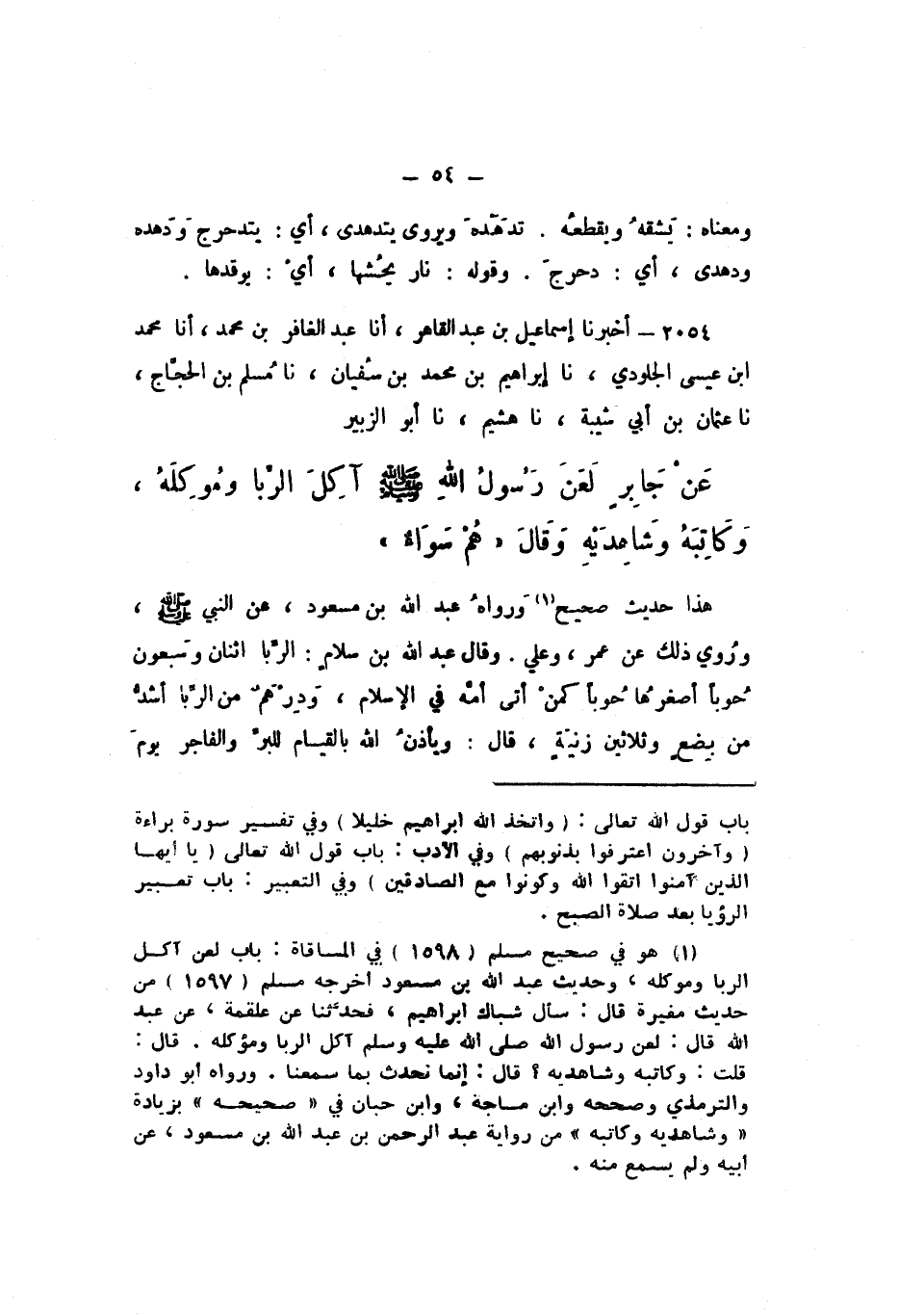 2054 - أَخْبَرَنَا إِسْمَاعِيلُ بْنُ عَبْدِ الْقَاهِرِ، أَنا عَبْدُ الْغَافِرِ بْنُ مُحَمَّدٍ، أَنا مُحَمَّدُ بْنُ عِيسَى الْجُلُودِيُّ، نَا إِبْرَاهِيمُ بْنُ مُحَمَّدِ بْنِ سُفْيَانَ، نَا مُسْلِمُ بْنُ الْحَجَّاجِ، نَا عُثْمَانُ بْنُ أَبِي شَيْبَةَ، نَا هُشَيْمٌ، نَا أَبُو الزُّبَيْرِ، عَنْ جَابِرٍ: «لَعَنَ رَسُولُ اللَّهِ صَلَّى اللهُ عَلَيْهِ وَسَلَّمَ آكِلَ الرِّبَا، وَمُوكِلَهُ، وَكَاتِبَهُ، وَشَاهِدَيْهِ»، وَقَالَ: «هُمْ سَوَاءٌ».