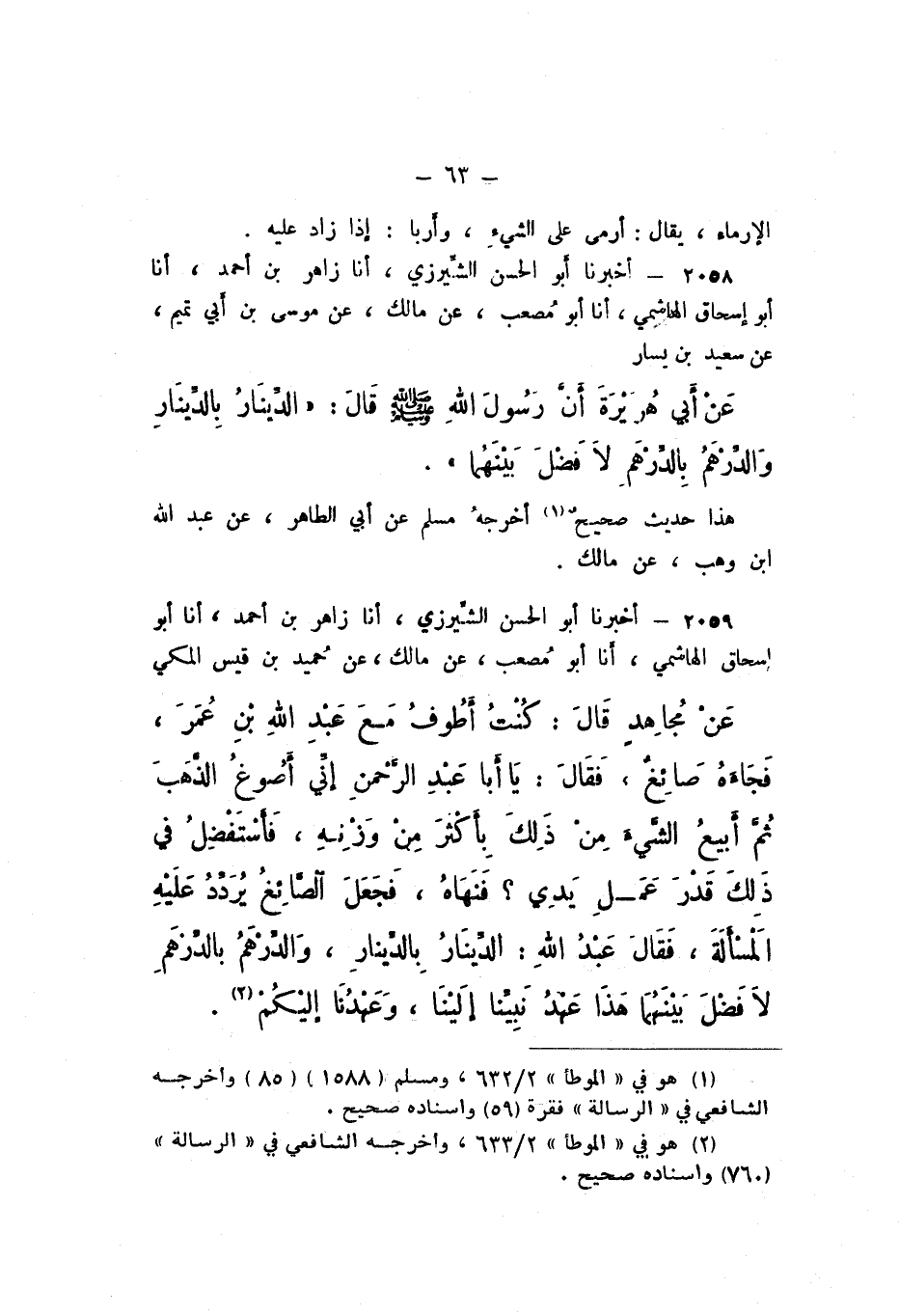2059 - أَخْبَرَنَا أَبُو الْحَسَنِ الشِّيرَزِيُّ، أَنا زَاهِرُ بْنُ أَحْمَدَ، أَنا أَبُو إِسْحَاقَ الْهَاشِمِيُّ، أَنا أَبُو مُصْعَبٍ، عَنْ مَالِكٍ، عَنْ حُمَيْدِ بْنِ قَيْسٍ الْمَكِّيِّ، عَنْ مُجَاهِدٍ، قَالَ: كُنْتُ أَطُوفُ مَعَ عَبْدِ اللَّهِ بْنِ عُمَرَ، فَجَاءَهُ صَائِغٌ، فَقَالَ: يَا أبَا عَبْدِ الرَّحْمَنِ، إِنِّي أَصُوغُ الذَّهَبَ، ثُمَّ أَبِيعُ الشَّيْءَ مِنْ ذَلِكَ بِأَكْثَرَ مِنْ وَزْنِهِ، فَأَسْتَفْضِلُ فِي ذَلِكَ قَدْرَ عَمَلِ يَدِي؟ فَنَهَاهُ، فَجَعَلَ الصَّائِغُ يُردِّدُ عَلَيْهِ الْمَسْأَلَةَ، فَقَالَ عَبْدُ اللَّهِ: الدِّينَارُ بِالدِّينَارِ وَالدِّرْهَمُ بِالدِّرْهَمِ، لَا فَضْلَ بَيْنَهُمَا، هَذَا عَهْدُ نَبِيِّنَا إِلَيْنَا، وَعَهْدُنَا إِلَيْكُمْ