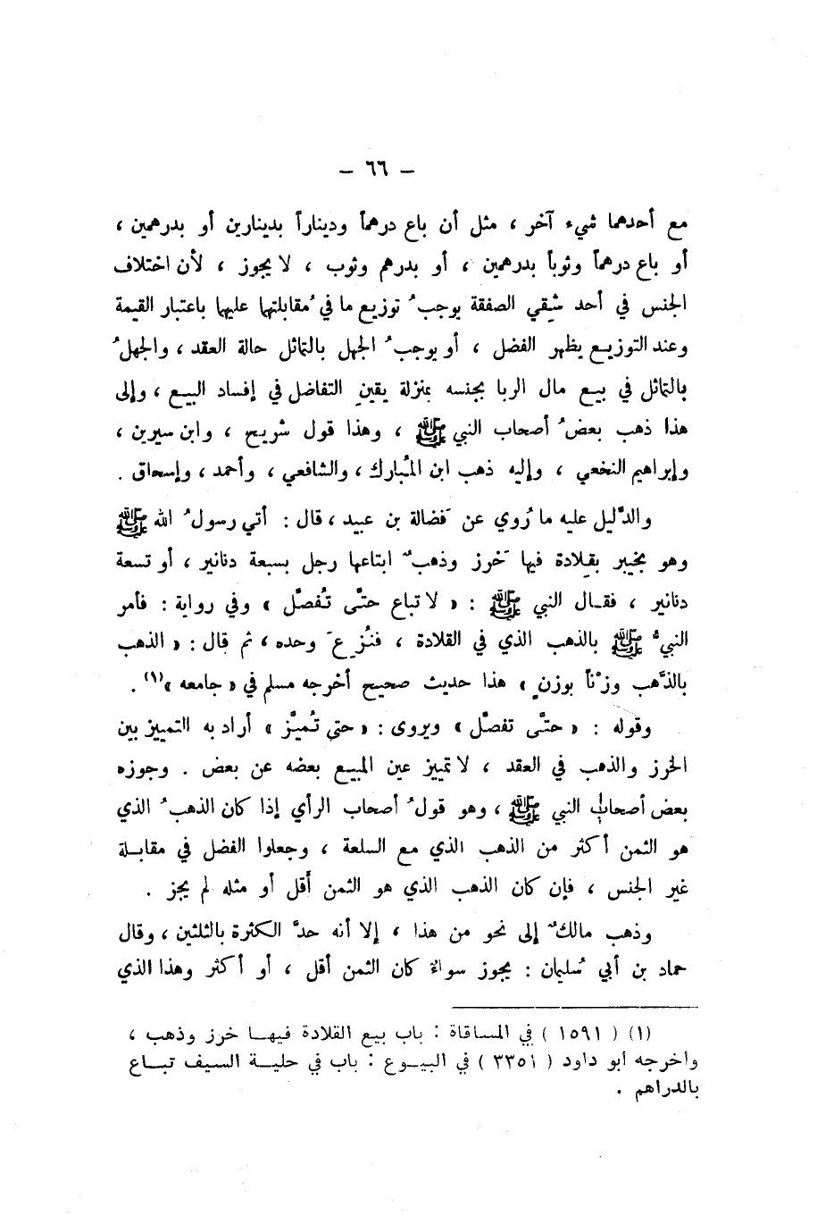 وَالدَّلِيلُ عَلَيْهِ مَا رُوِيَ عَنْ فَضَالَةَ بْنِ عُبَيْدٍ قَالَ: أُتِيَ رَسُولُ اللَّهِ صَلَّى اللهُ عَلَيْهِ وَسَلَّمَ، وَهُوَ بِخَيْبَرَ، بِقِلادَةٍ فِيهَا خَرَزٌ وَذَهَبٌ، ابْتَاعَهَا رَجُلٌ بِسَبْعَةِ دَنَانِيرَ، أَوْ تِسْعَةِ دَنَانِيرَ، فَقَالَ النَّبِيُّ صَلَّى اللهُ عَلَيْهِ وَسَلَّمَ: «لَا تُبَاعُ حَتَّى تُفَصَّلَ»، وَفِي رِوَايَةٍ: فَأَمَرَ النَّبِيُّ صَلَّى اللهُ عَلَيْهِ وَسَلَّمَ بِالذَّهَبِ الَّذِي فِي الْقِلادَةِ، فَنُزِعَ وَحْدَهُ، ثُمَّ قَالَ: «الذَّهَبُ بِالذَّهَبِ وَزْنًا بِوَزْنٍ» هَذَا حَدِيثٌ صَحِيحٌ، أَخْرَجَهُ مُسْلِمٌ فِي جَامِعِهِ.