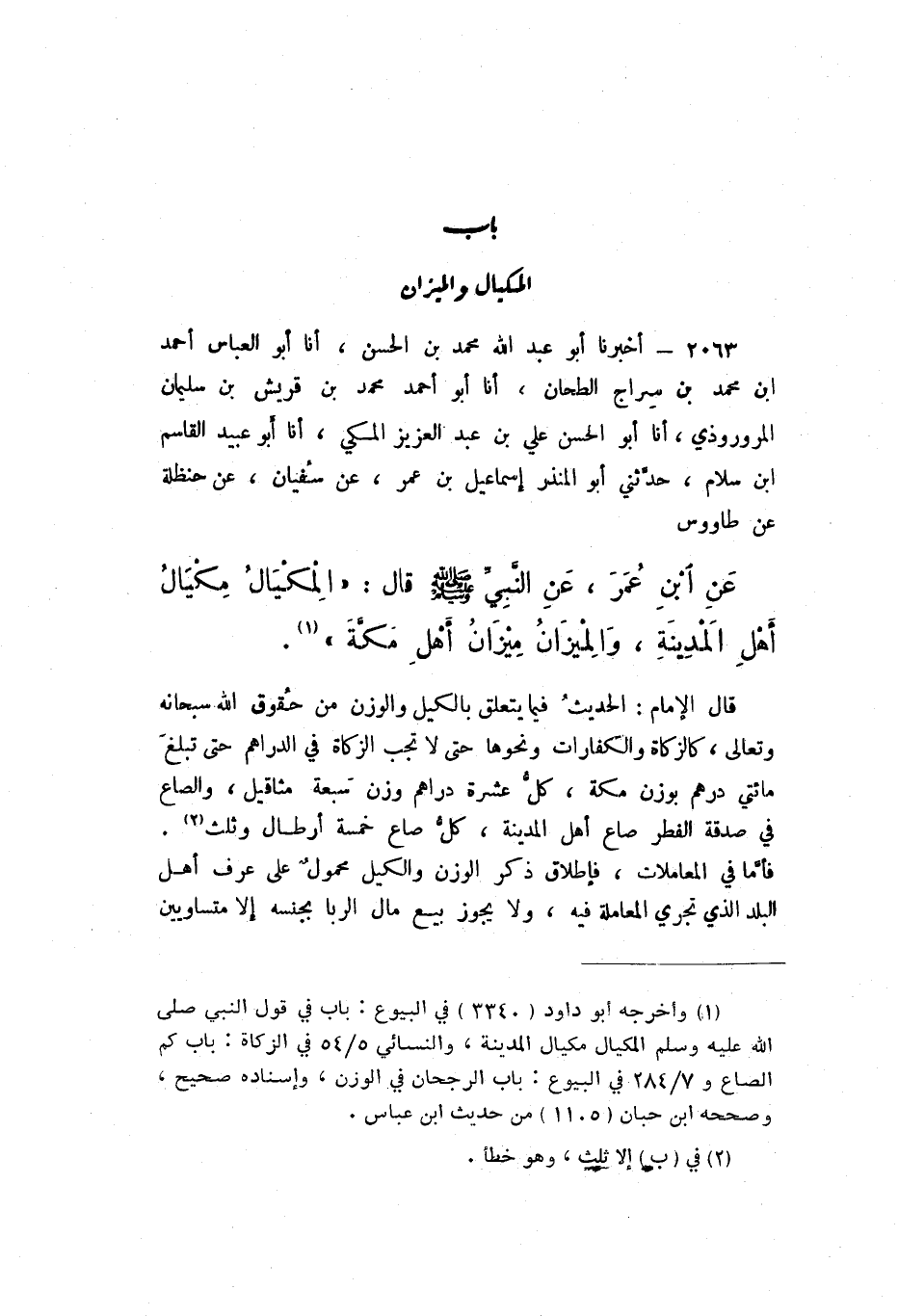 2063 - أَخْبَرَنَا أَبُو عَبْدِ اللَّهِ مُحَمَّدُ بْنُ الْحَسَنِ، أَنا أَبُو الْعَبَّاسِ أَحْمَدُ بْنُ مُحَمَّدِ بْنِ سِرَاجٍ الطَّحَّانُ، أَنا أَبُو أَحْمَدَ مُحَمَّدُ بْنُ قُرَيْشِ بْنِ سُلَيْمَانَ الْمَرْوَرُّوذِيُّ، أَنا أَبُو الْحَسَنِ عَلِيُّ بْنُ عَبْدِ الْعَزِيزِ الْمَكِّيُّ، أَنا أَبُو عُبَيْدٍ الْقَاسِمُ بْنُ سَلامٍ، حدَّثَنِي أَبُو الْمُنْذِرِ إِسْمَاعِيلُ بْنُ عُمَرَ، عَنْ سُفْيَانَ، عَنْ حَنْظَلَةَ، عَنْ طَاوُسٍ، عَنِ ابْنِ عُمَرَ، عَنِ النَّبِيِّ صَلَّى اللهُ عَلَيْهِ وَسَلَّمَ، قَالَ: «الْمِكْيَالُ مِكْيَالُ أَهْلِ الْمَدِينَةِ، وَالْمِيزَانُ مِيزَانُ أَهْلِ مَكَّةَ».