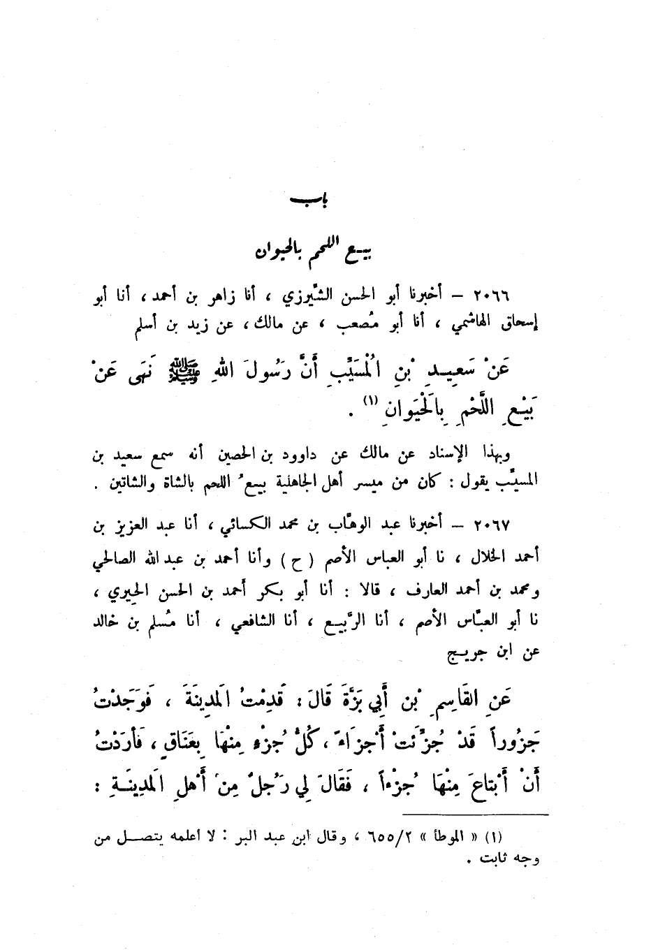 2066 - أَخْبَرَنَا أَبُو الْحَسَنِ الشِّيرَزِيُّ، أَنا زَاهِرُ بْنُ أَحْمَدَ، أَنا أَبُو إِسْحَاقَ الْهَاشِمِيُّ، أَنا أَبُو مُصْعَبٍ، عَنْ مَالِكٍ، عَنْ زَيْدِ بْنِ أَسْلَمَ، عَنْ سَعِيدِ بْنِ الْمُسَيِّبِ: أَنَّ رَسُولَ اللَّهِ صَلَّى اللهُ عَلَيْهِ وَسَلَّمَ «نَهَى عَنْ بَيْعِ اللَّحْمِ بِالْحَيَوَانِ».