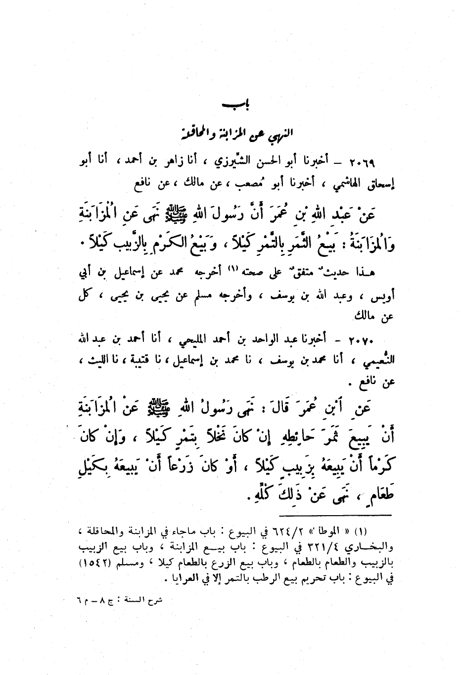 2069 - أَخْبَرَنَا أَبُو الْحَسَنِ الشِّيرَزِيُّ، أَنا زَاهِرُ بْنُ أَحْمَدَ، أَنا أَبُو إِسْحَاقَ الْهَاشِمِيُّ، أَخْبَرَنَا أَبُو مُصْعَبٍ، عَنْ مَالِكٍ، عَنْ نَافِعٍ، عَنْ عَبْدِ اللَّهِ بْنِ عُمَرَ أَنّ رَسُولَ اللَّهِ صَلَّى اللهُ عَلَيْهِ وَسَلَّمَ «نَهَى عَنِ الْمُزَابَنَةِ».