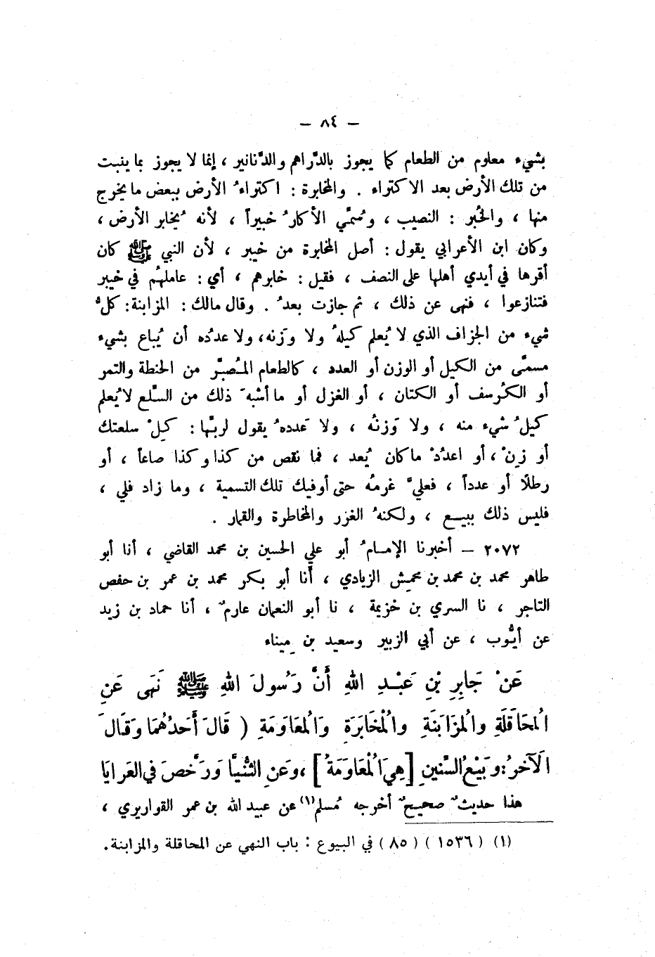 2072 - أَخْبَرَنَا الإِمَامُ أَبُو عَلِيٍّ الْحُسَيْنُ بْنُ مُحَمَّدٍ الْقَاضِي، أَنا أَبُو طَاهِرٍ مُحَمَّدُ بْنُ مُحَمَّدِ بْنِ مَحْمِشٍ الزِّيَادِيُّ، أَنا أَبُو بَكْرٍ مُحَمَّدُ بْنُ عُمَرَ بْنِ حَفْصٍ التَّاجِرُ، نَا السَّرِيُّ بْنُ خُزَيْمَةَ، نَا أَبُو النُّعْمَانِ عَارِمٌ، أَنا حَمَّادُ بْنُ زَيْدٍ، عَنْ أَيُّوبَ، عَنْ أَبِي الزُّبَيْرِ، وَسَعِيدِ بْنِ مِينَاءَ، عَنْ جَابِرِ بْنِ عَبْدِ اللَّهِ أَنَّ رَسُولَ اللَّه صَلَّى اللهُ عَلَيْهِ وَسَلَّمَ «نَهَى عَنِ الْمُحَاقَلَةِ، وَالْمُزَابَنَةِ، وَالْمُخَابَرَةِ، وَالْمُعَاوَمَةِ» قَالَ أَحَدُهُمَا، وَقَالَ الآخَرُ: «وَبيْعُ السِّنِينَ، هِيَ الْمُعَاوَمَةُ» «وَعَنِ الثُّنَيَّا، وَرَخَّصَ فِي الْعَرَايَا».