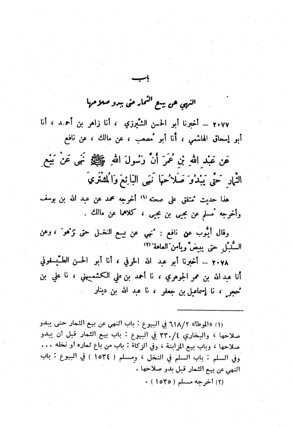 2077 - أَخْبَرَنَا أَبُو الْحَسَنِ الشِّيرَزِيُّ، أَنا زَاهِرُ بْنُ أَحْمَدَ، أَنا أَبُو إِسْحَاقَ الْهَاشِمِيُّ، أَنا أَبُو مُصْعَبٍ، عَنْ مَالِكٍ، عَنْ نَافِعٍ، عَن عَبْدِ اللَّهِ بْنِ عُمَرَ، أَنّ رَسُولَ اللَّهِ صَلَّى اللهُ عَلَيْهِ وَسَلَّمَ «نَهَى عَنْ بَيْعِ الثِّمَارِ حَتَّى يَبْدُوَ صَلاحُهَا، نَهَى الْبَائِعَ وَالْمُشْتَرِيَ».