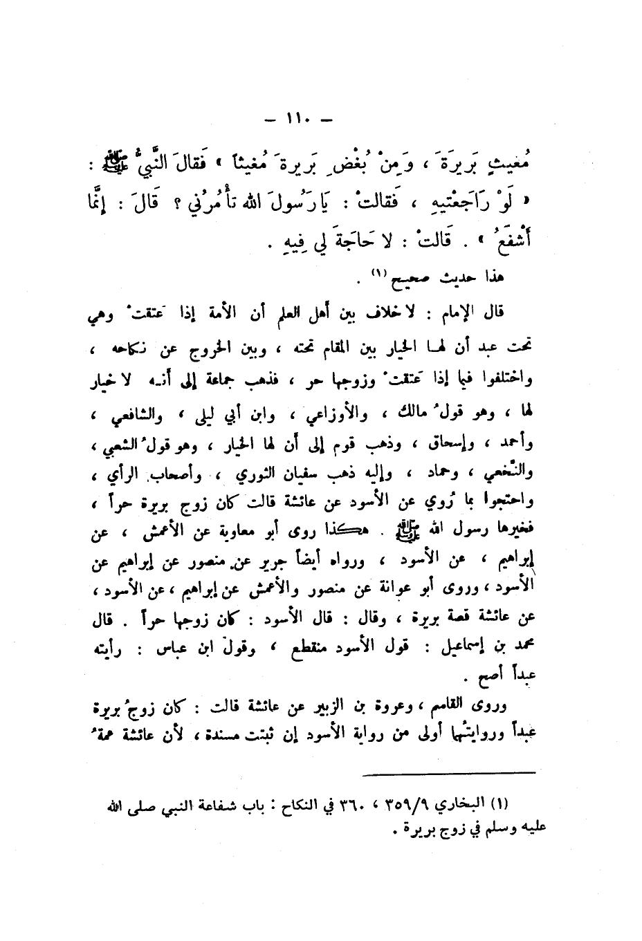قَالَ الإِمَامُ: لَا خلاف بَين أهل الْعلم أَن الْأمة إِذا عتقتْ وَهِي تَحت عبد، أَن لَهَا الْخِيَار بَين الْمقَام تَحْتَهُ، وَبَين الْخُرُوج عَنْ نِكَاحه، وَاخْتلفُوا فِيمَا إِذا عتقت وَزوجهَا حر، فَذهب جمَاعَة إِلَى أَنَّهُ لَا خِيَار لَهَا، وَهُوَ قولُ مَالِك، وَالأَوْزَاعِيّ، وَابْن أَبِي ليلى، وَالشَّافِعِيّ، وَأَحْمَد، وَإِسْحَاق، وَذهب قوم إِلَى أَن لَهَا الْخِيَار، وَهُوَ قولُ الشَّعْبِيّ، والنِّخعي، وَحَمَّاد، وَإِلَيْهِ ذهب سُفْيَان الثَّوْرِيّ، وَأَصْحَاب الرَّأْي، وَاحْتَجُّوا بِمَا رُوي عَنِ الْأسود، عَنْ عَائِشَة، قَالَت: كَانَ زوج بَرِيرَة حرا، فَخَيرهَا رَسُولُ اللَّه صَلَّى اللهُ عَلَيْهِ وَسَلَّمَ.